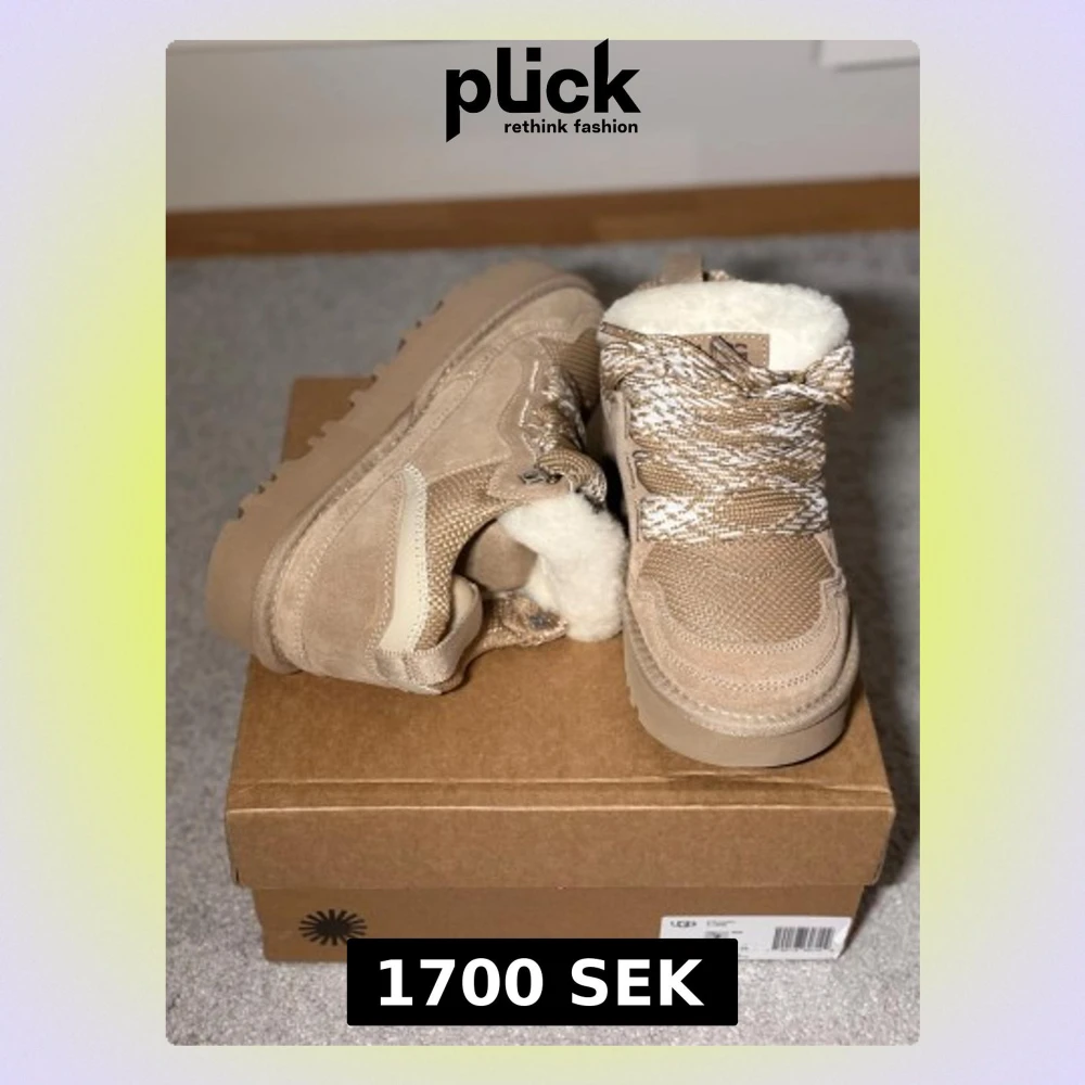 Snygga beige sneakers från UGG med grov sula, snörning och insida i mjuk fårull. Ovandel i mocka och textil, detaljerade mönstrade skosnören och UGG-logga på sidan. Perfekta för kyliga dagar när du vill vara både varm och trendig.