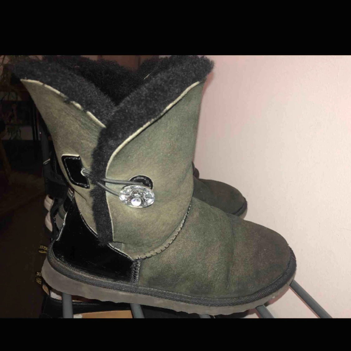 Svarta uggs i äkta fårskinn med svarowski sten på sidan. Kan både användas nedvikta och uppvikta. Köpta i Australien! Dustbag medföljer