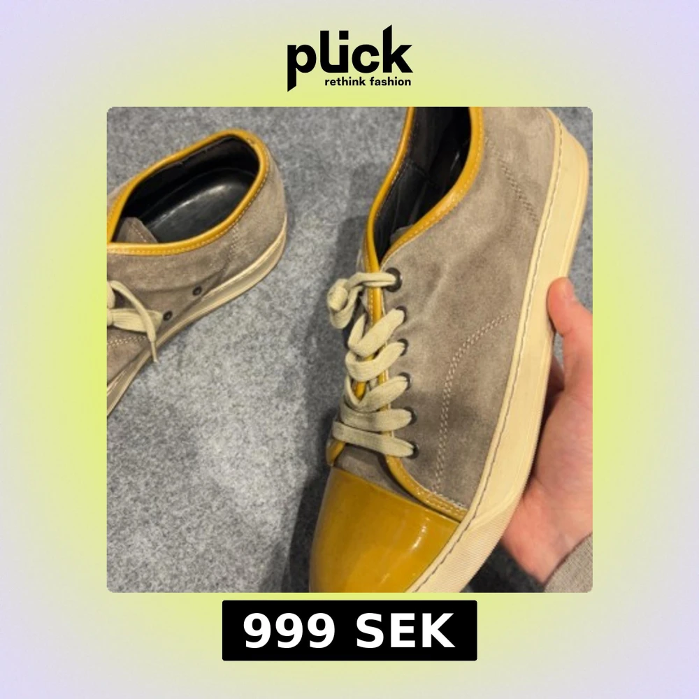 Snygga sneakers i beige mocka med kontrasterande gul lackad tå och gul kant runt öppningen. Skorna har beige snörning och en platt, ljus sula. Perfekt för dig som gillar unika färgkombinationer och vill sticka ut lite extra.