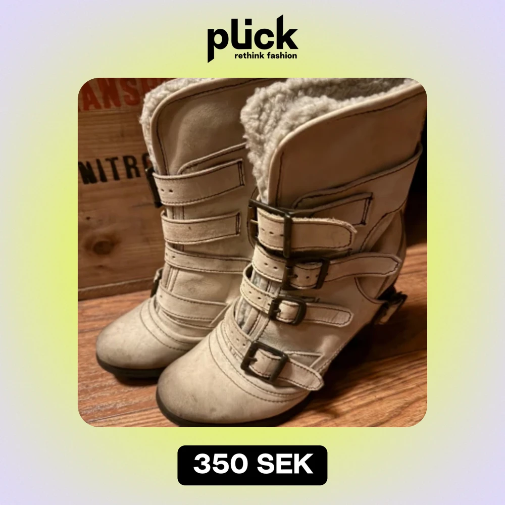 Säljer ett par snygga beige boots med teddyfoder som håller dig varm under vintern. De har flera dekorativa spännen och en bekväm klack. Perfekta för både vardag och fest!