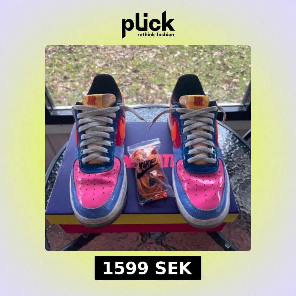 Säljer ett par unika och färgglada Nike air force 1 i samarbete med undefeated. Skulle säga att de är i ett bra skick bara lite smutsiga på sulan men kan tvättas och är lite creasade. De är ganska sällsynta. Säljs för att de är för små. Storlek 43. Alla tillbehör ingår. Säljs för typ 2000 plus på andra sidor.