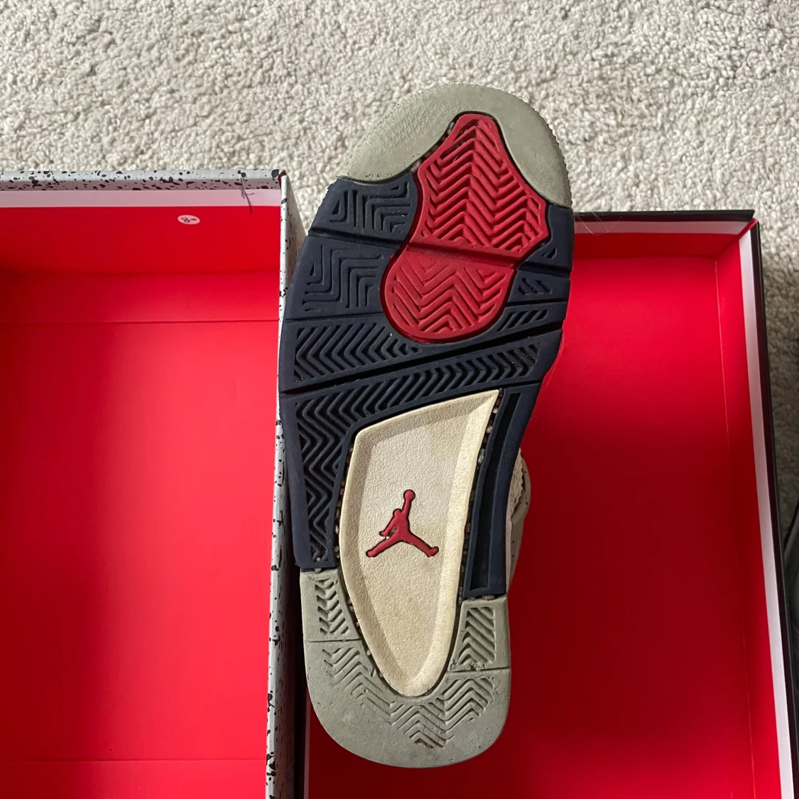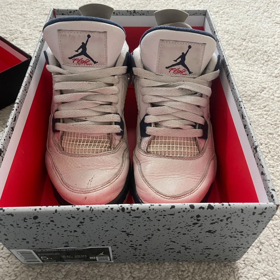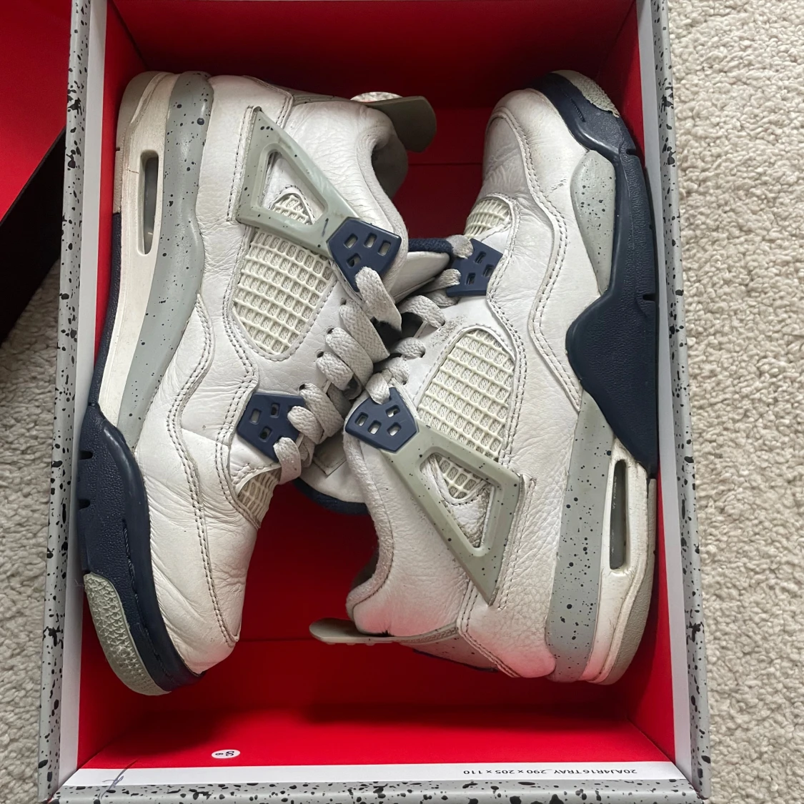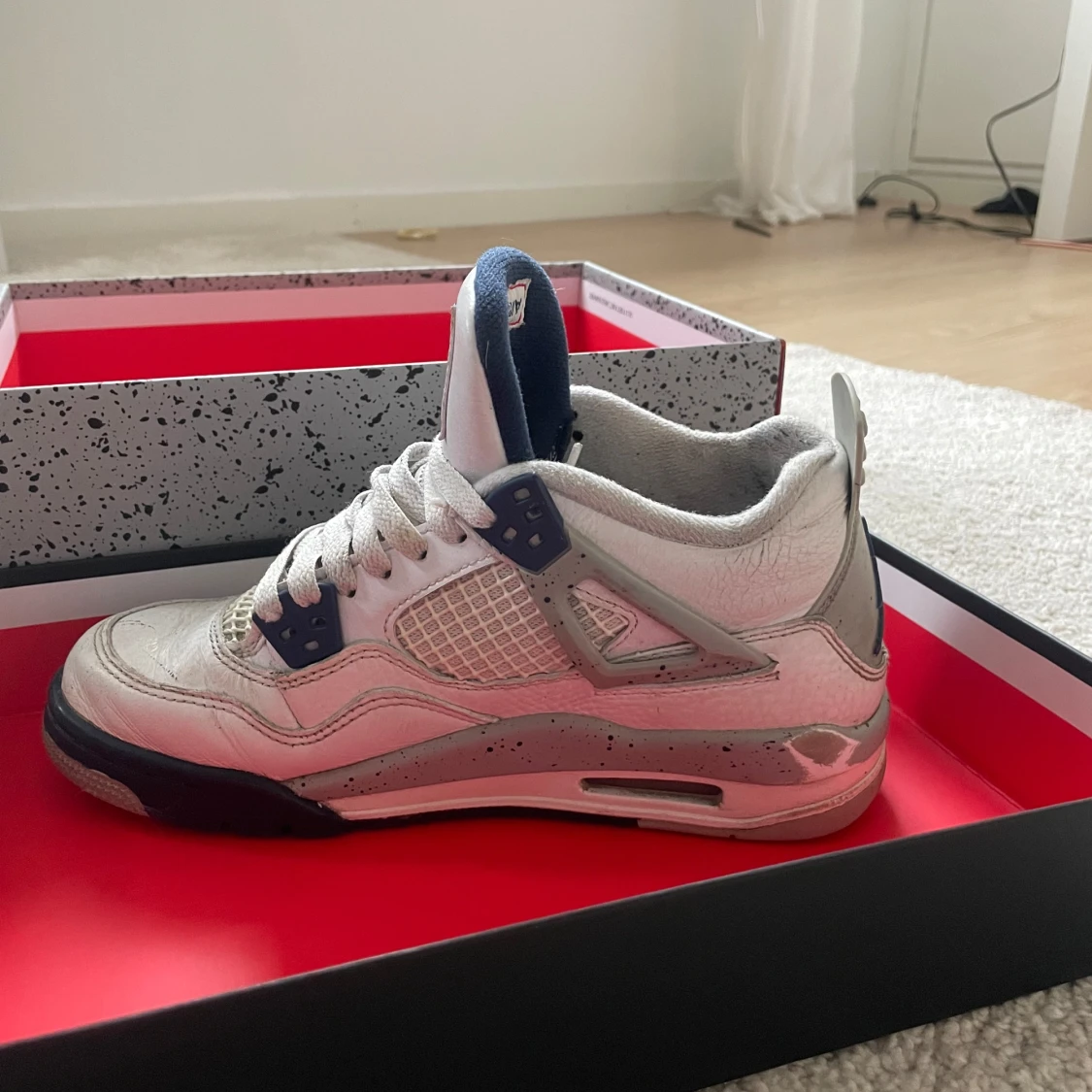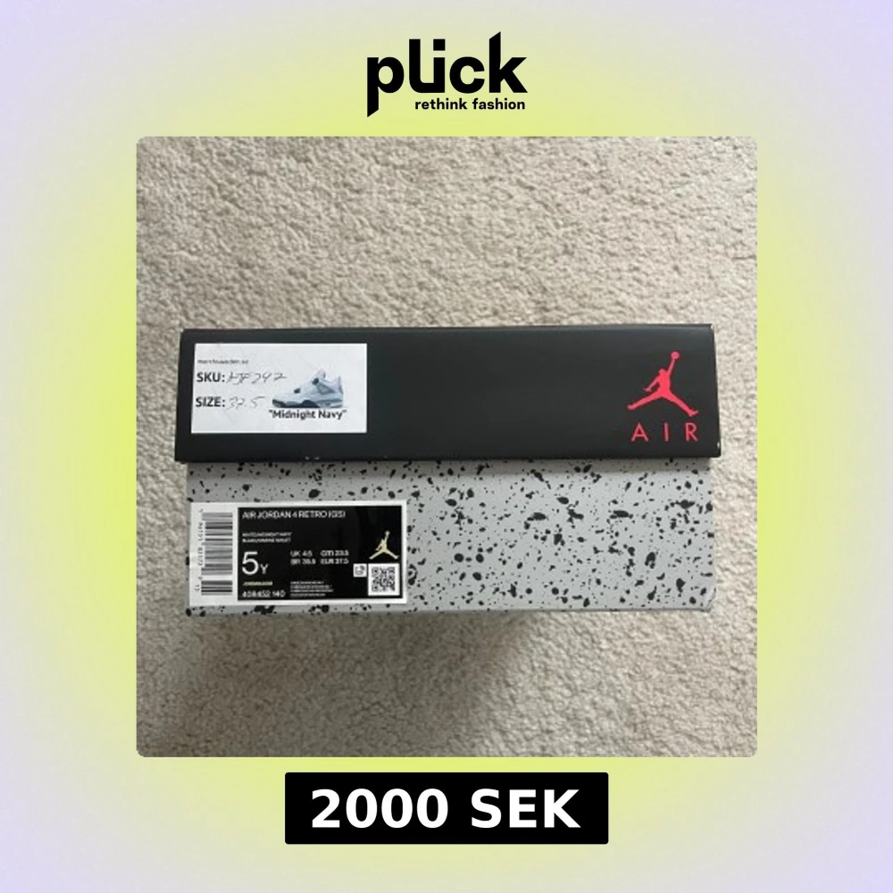 Nike Air Jordan 4 Retro 'Midnight Navy', i original box. Köpta för 4999kr från ”merchsweden.se”. Ej använda så mycket men en defekt på ena skon vilket man kan se på fjärde bilden. Unisex skor i storlek 37,5.