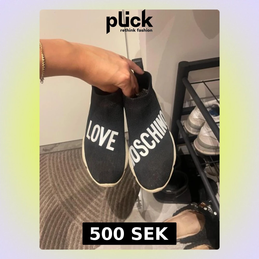 Svarta sneakers från Love Moschino med vit text på ovansidan och chunky vit sula. Stickad ovandel i syntetmaterial, röda hjärtan bak på hälen och under sulan. Snygg och unik design med platt sula och rund tå. Perfekt för dig som gillar statement pieces.
