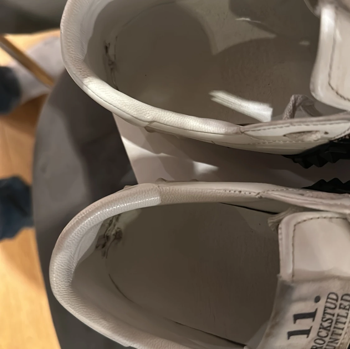 Snygga vita valentinos med fina unika spikar dock så har två spikar losnat och skorna är lite slitna men sitter fofarande skönt och gör sitt jobb. Är storlek 44 men sitter som storlek 43
