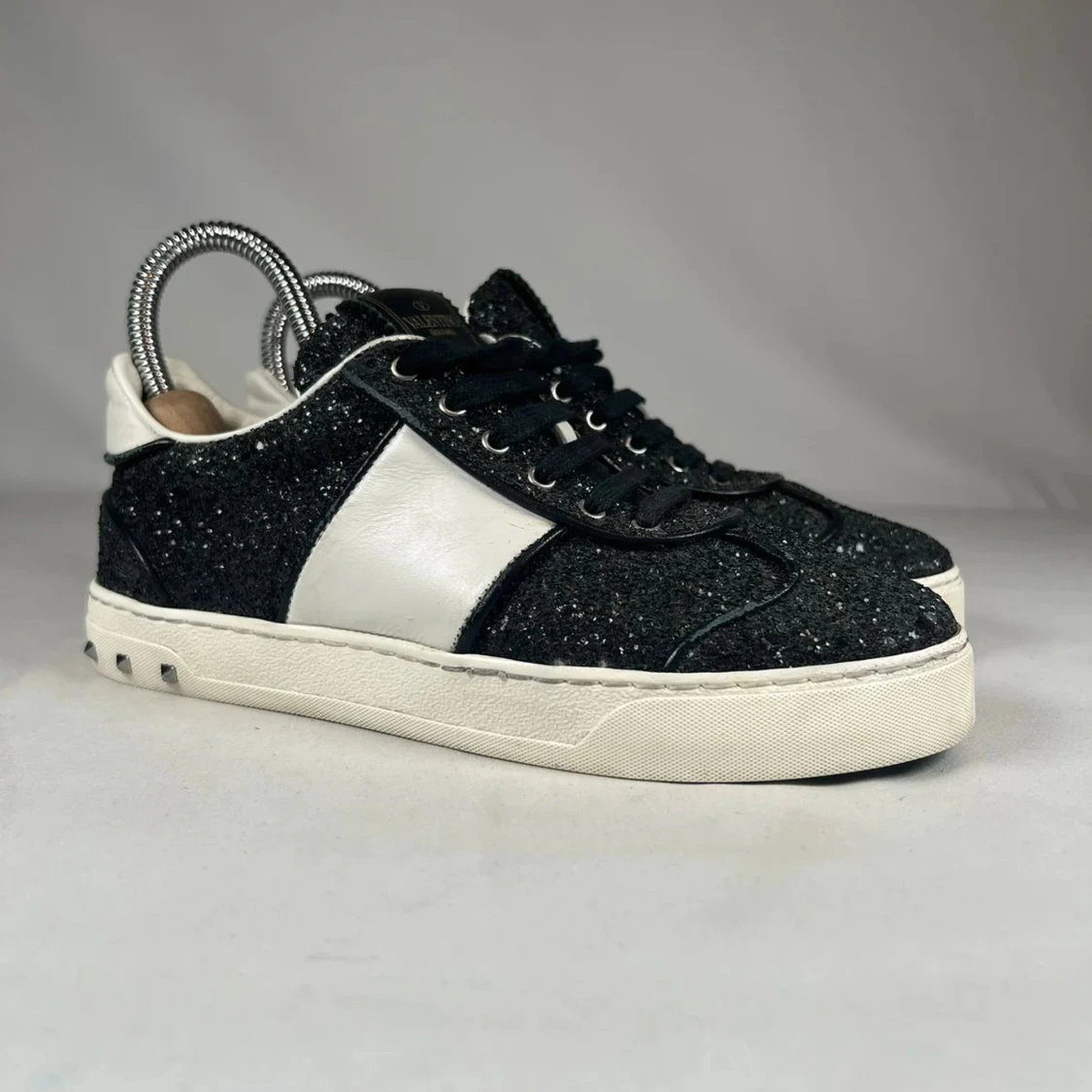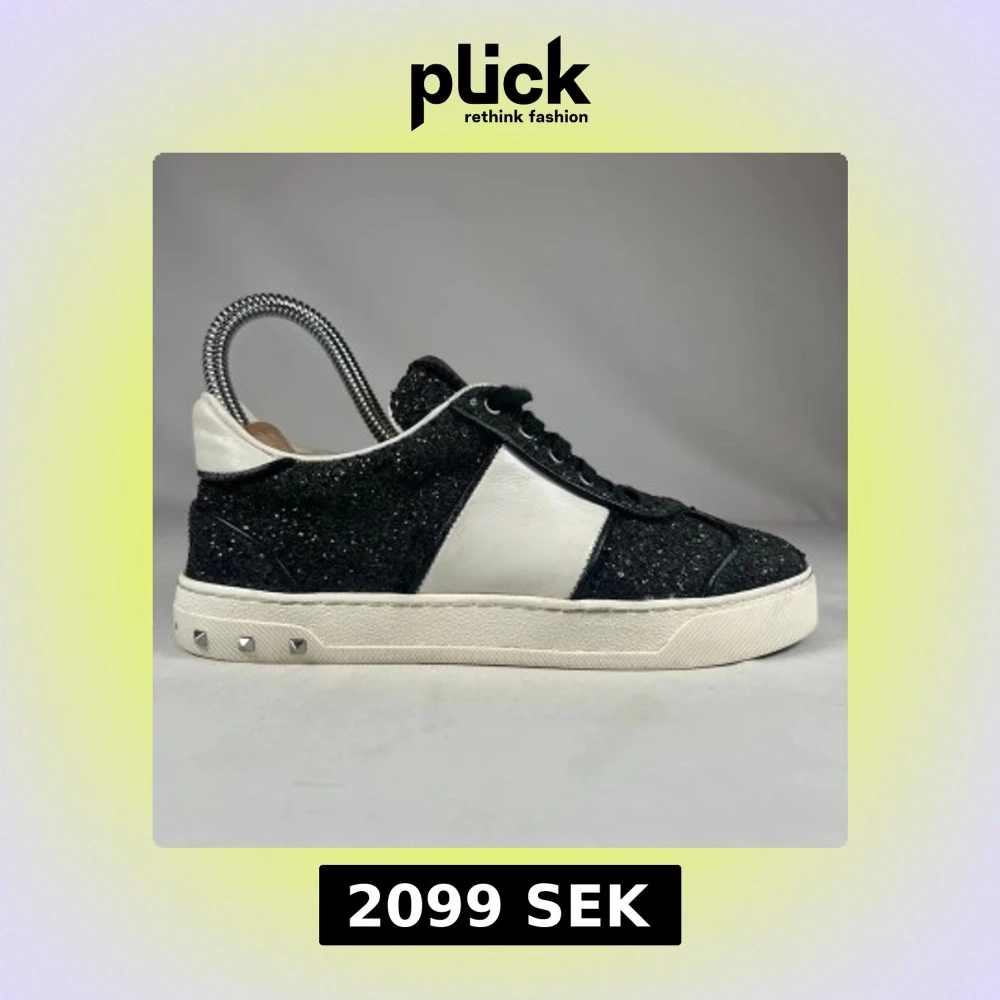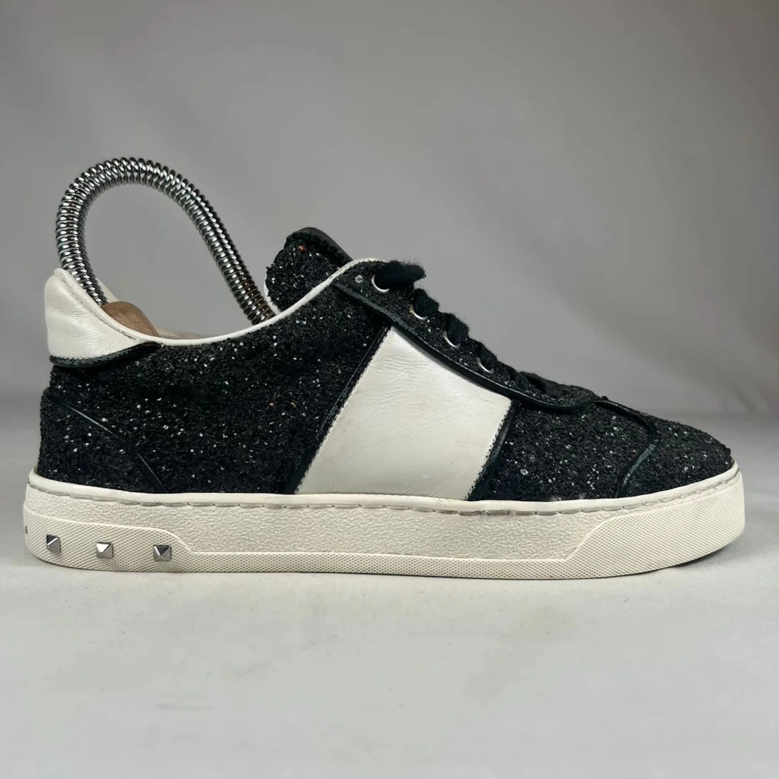Svarta och vita Valentino Garavani sneakers med glittrig ovandel och vita skinnpaneler. Klassisk rund tå, snörning och ikoniska nitar på sulan. Snygg kontrast mellan svart glitter och vitt skinn, perfekt för dig som vill sticka ut.