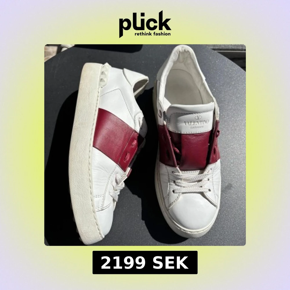 Snygga Valentino Garavani Open sneakers i vitt skinn med bred vinröd läderdetalj över mitten. Klassisk chunky sula med nitar baktill och logga på plösen. Skorna har vita snören och rund tå, perfekt för dig som gillar lyxiga statement-sneakers.