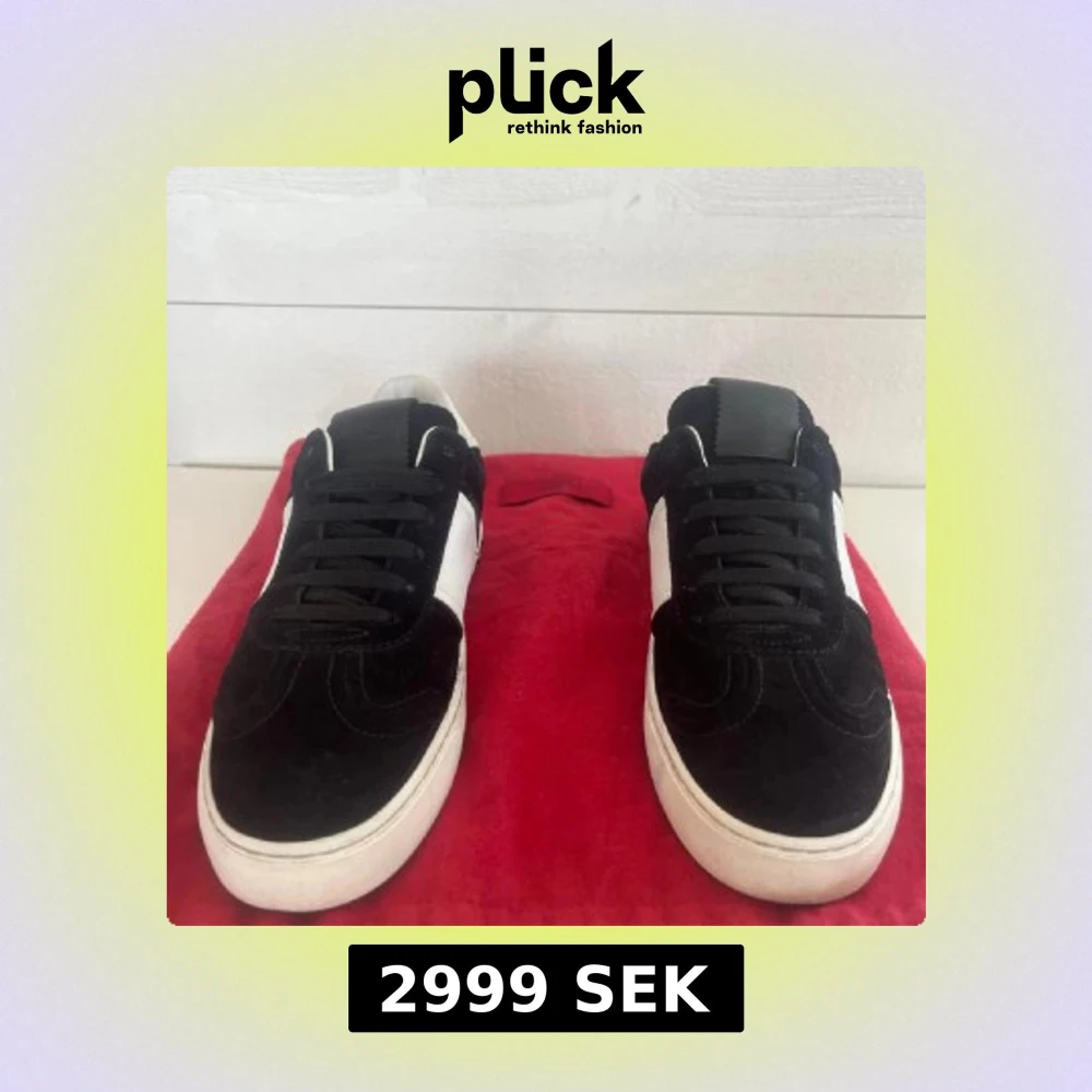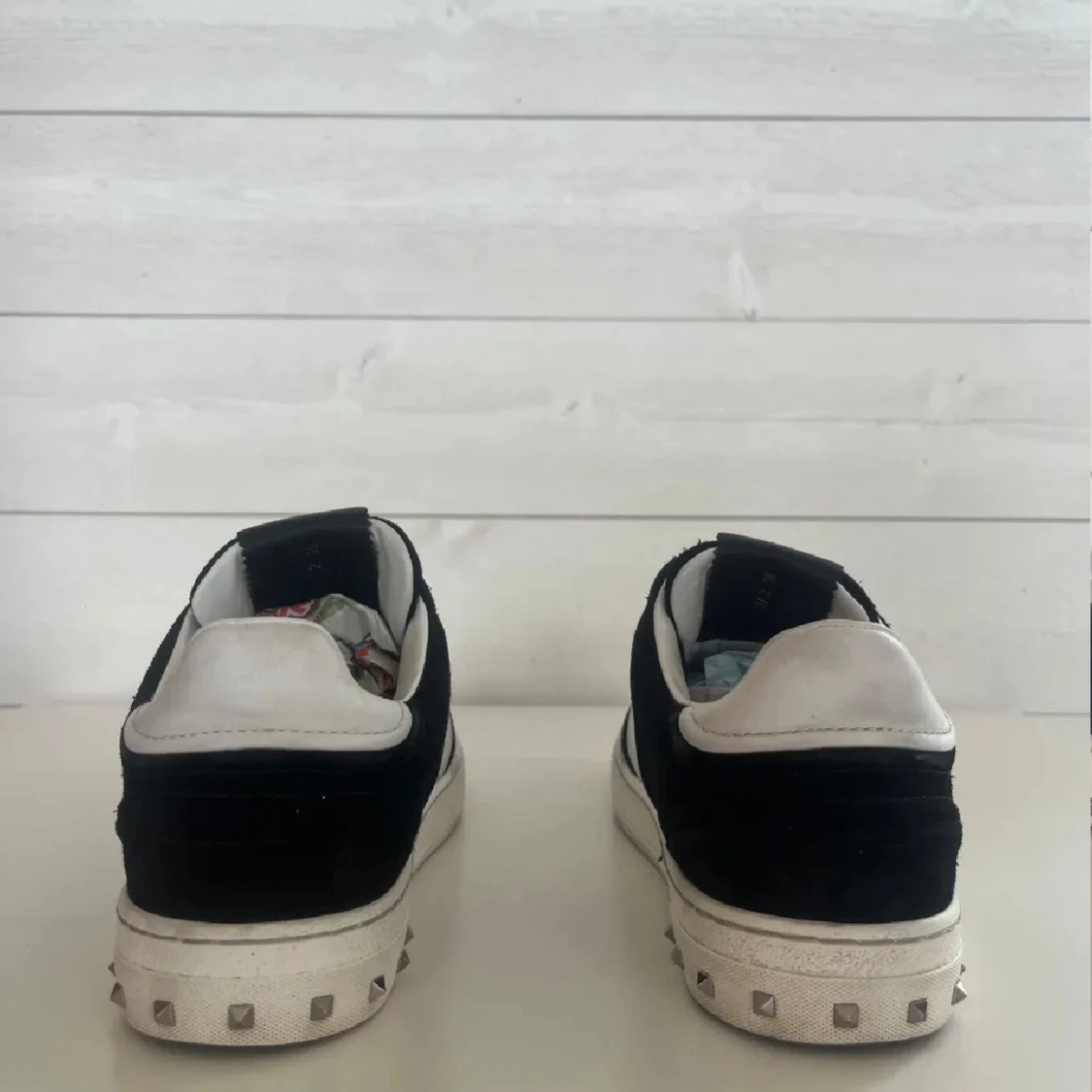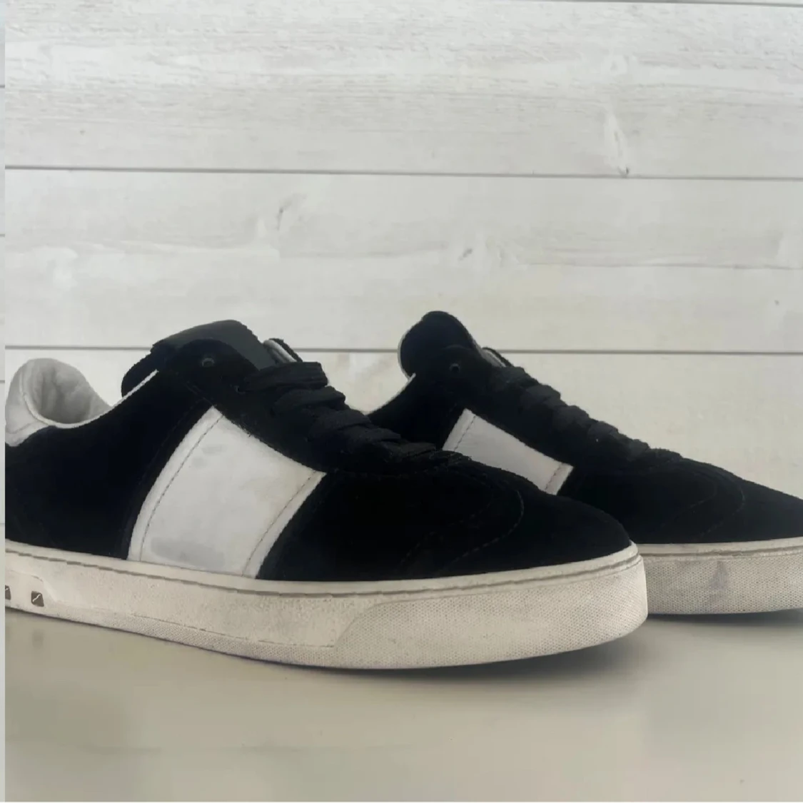 Svarta och vita sneakers från Valentino Garavani med klassisk låg siluett. Ovandel i mocka och skinn, svarta snören och vita detaljer. Snygga nitar längs hälen ger en edgy touch. Perfekta för dig som gillar streetstyle med lyxig känsla.