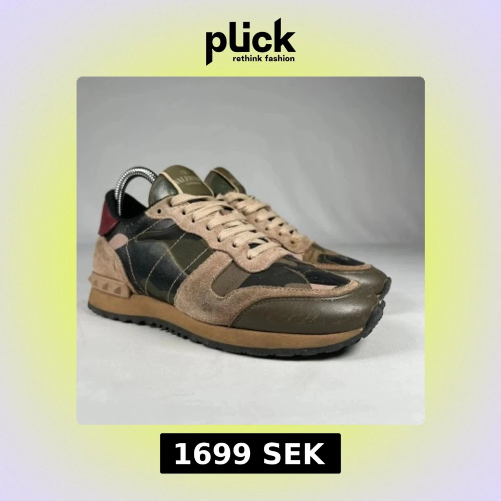 Snygga Valentino Rockrunner sneakers med ikoniskt camouflage-mönster i grönt, beige och svart. Skorna har detaljer i mocka, skinn och textil samt nitar på hälen. Skorna är i storlek 37 men passar 38 och säljs för 1699. Väldigt bra skick och endast använda ett par gånger. Nypris på skorna är 5300kr. Pris kan diskuteras!