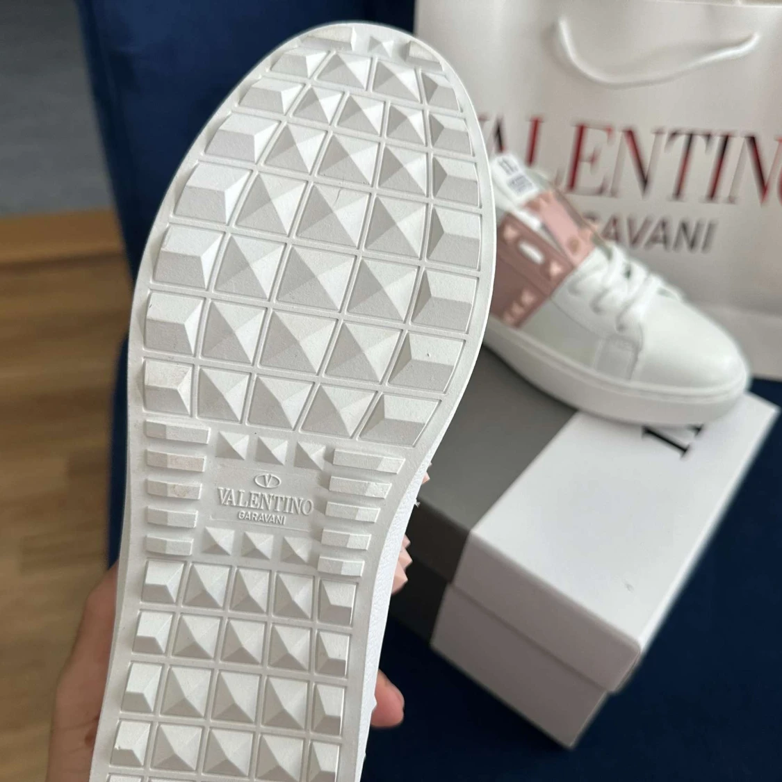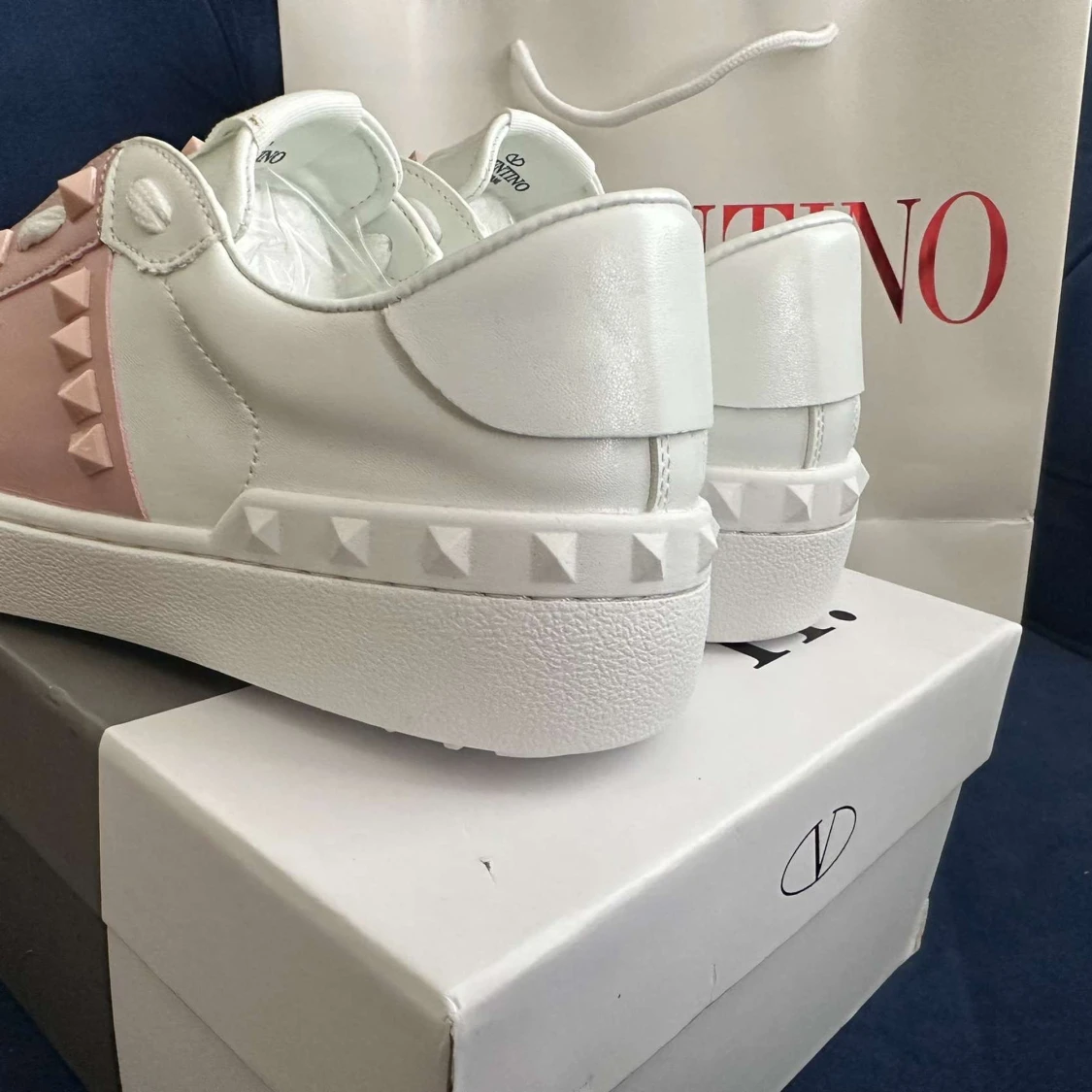 Snygga Valentino Rockstud Untitled sneakers i vitt skinn med ljusrosa detaljer och ikoniska nitar. Klassisk rund tå, platt sula och snörning framtill. Perfekt för dig som vill sticka ut med exklusiva och trendiga skor.