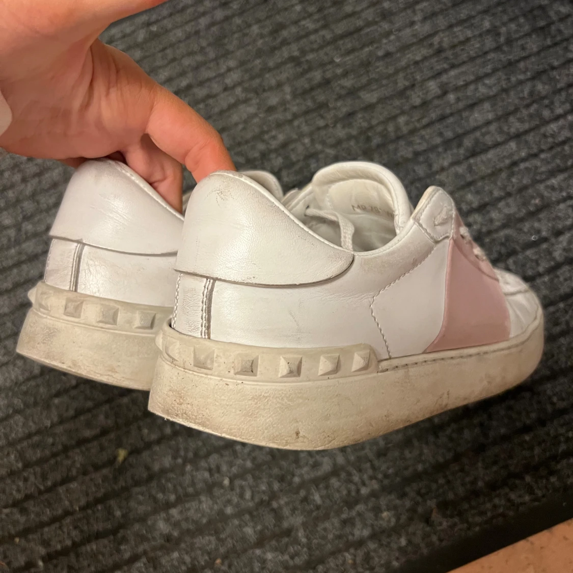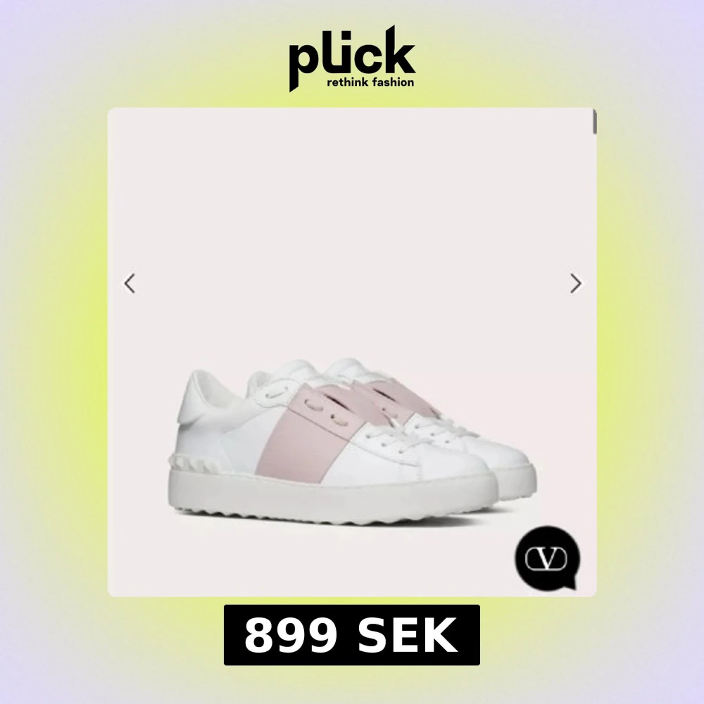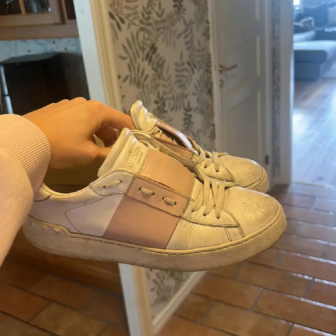 Snygga Valentino Open sneakers i vitt skinn med en bred ljusrosa rem över snörningen. Har blivit väldigt slitna därav priset, de mesta går nog att tvätta bort m🩷