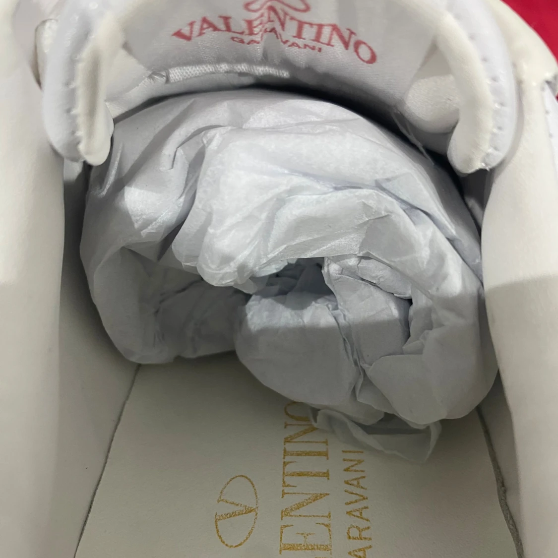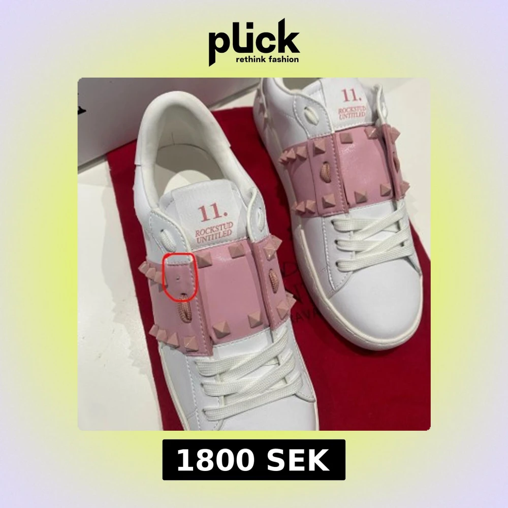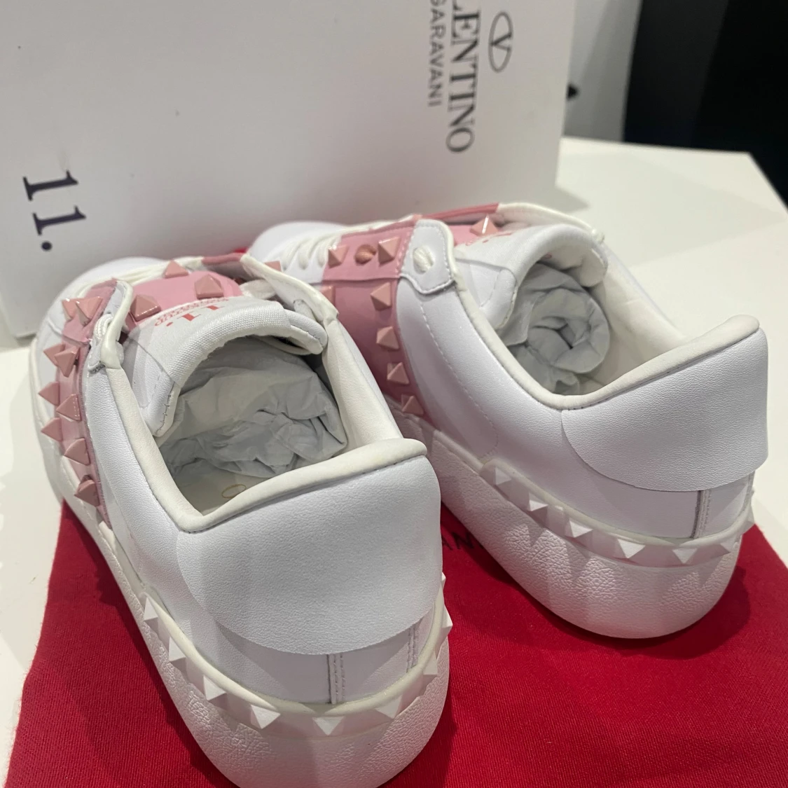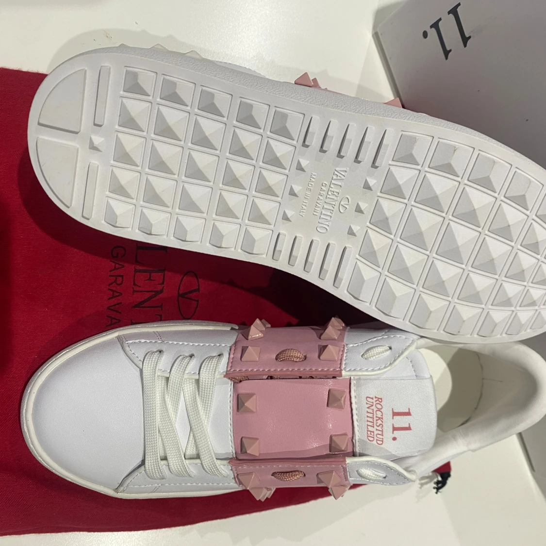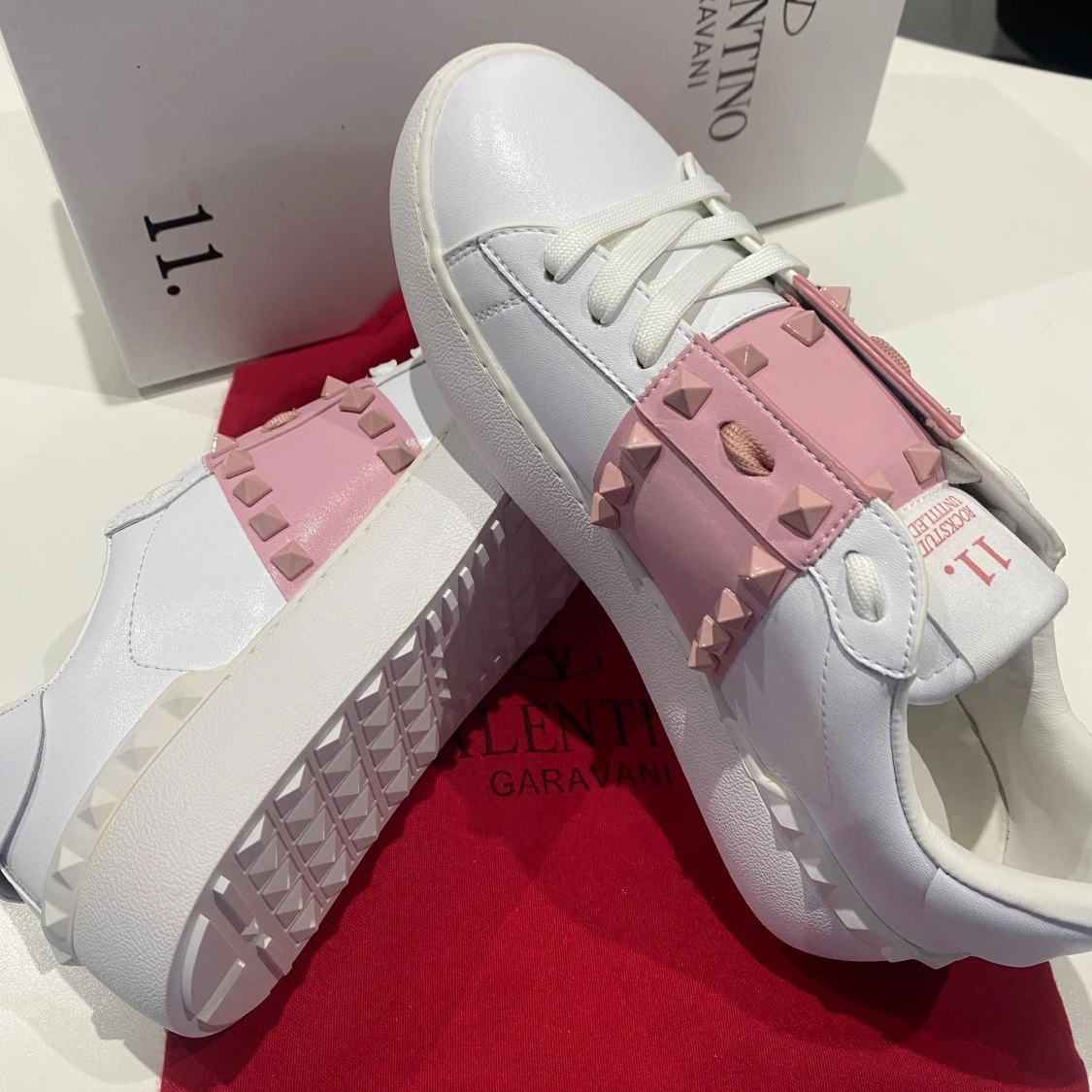 Snygga Valentino Rockstud Untitled sneakers i vitt skinn med breda rosa band och ikoniska pyramidnitar. Skorna har rund tå, platt sula och vita snören. Märkeslogga på plös och sula, samt coola detaljer runt hela skon. Perfekta för dig som vill sticka ut med lyxig streetstyle.
