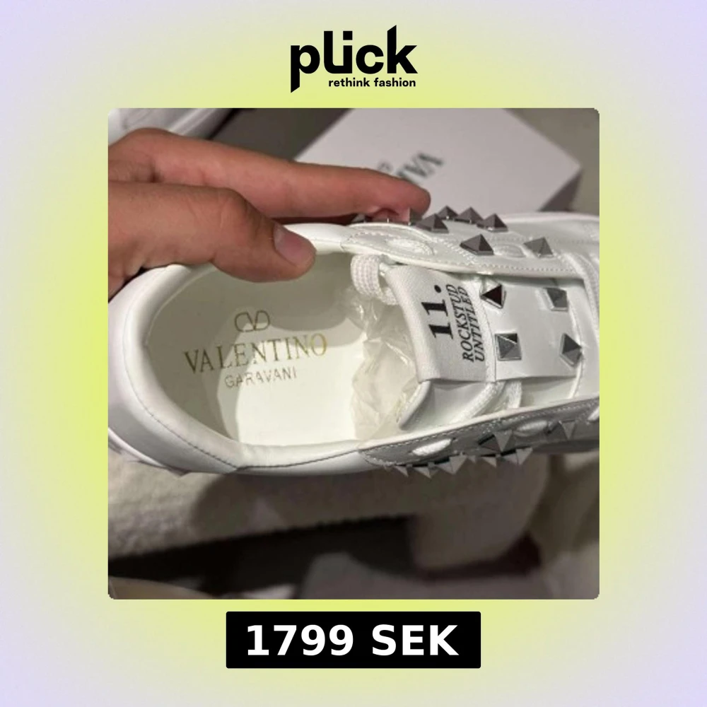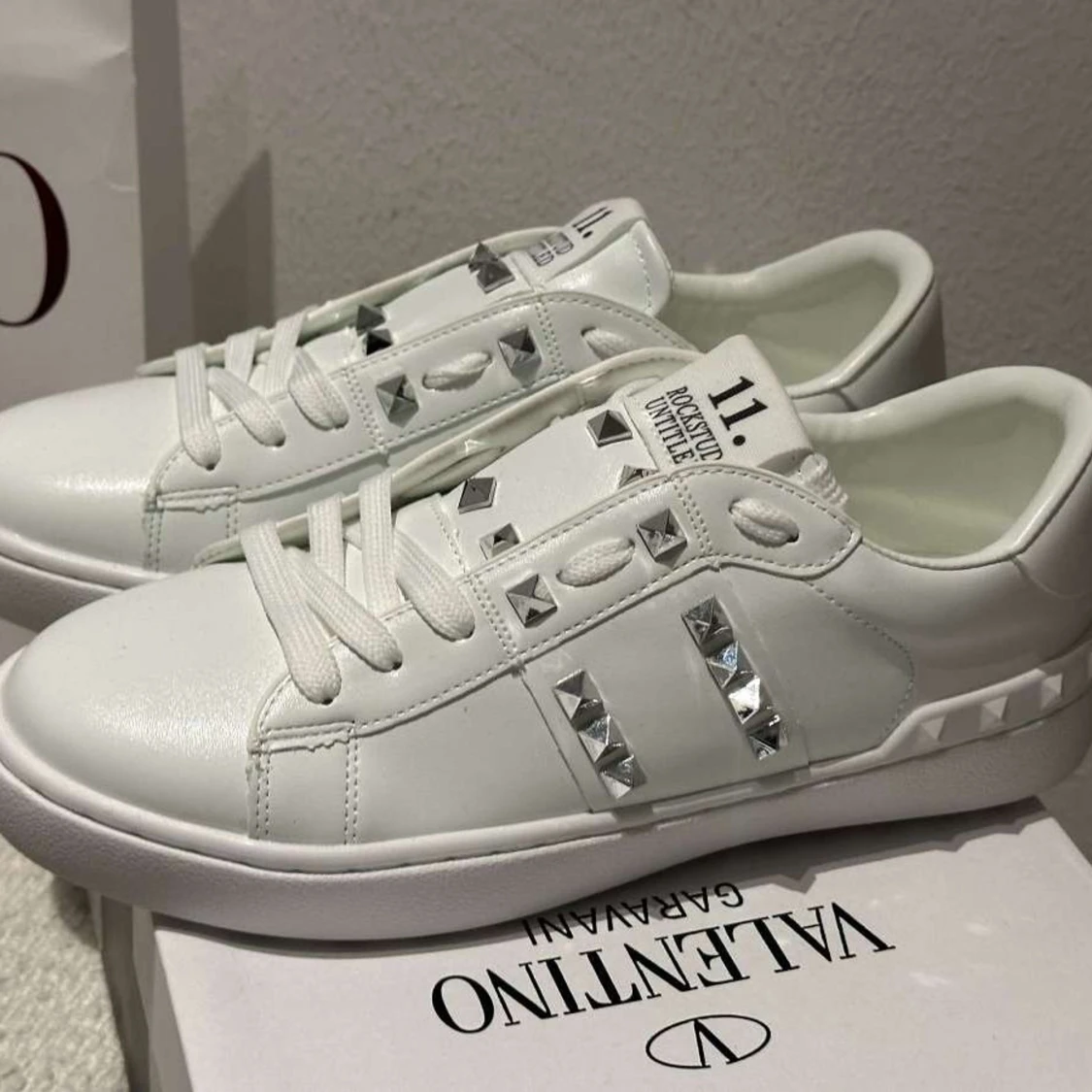 Snygga vita Valentino Garavani Rockstud Untitled sneakers i skinn med ikoniska silverfärgade nitar. Klassisk låg modell med snörning och platt sula. Perfekta för dig som vill sticka ut med exklusiva detaljer och stilren design.