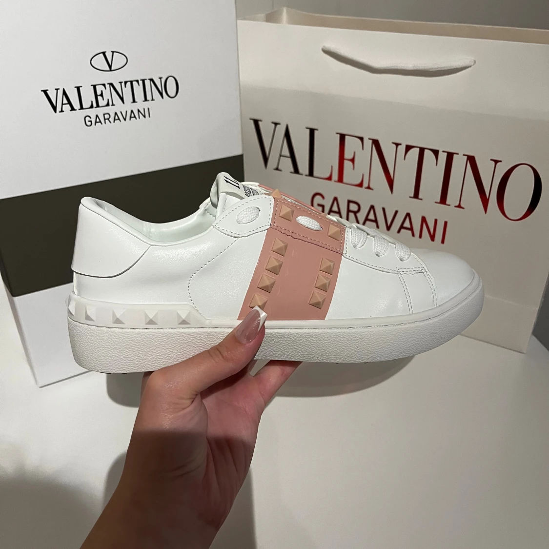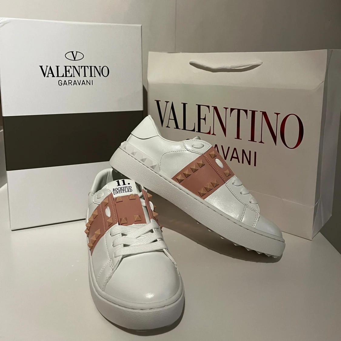 Säljer ett par Valentino sneakers i vitt skinn med ljusrosa band och ikoniska nitar. Skorna har rund tå, platt sula och snörning framtill. Perfekt för dig som vill ha en lyxig och edgy look med snygga detaljer från Valentino.