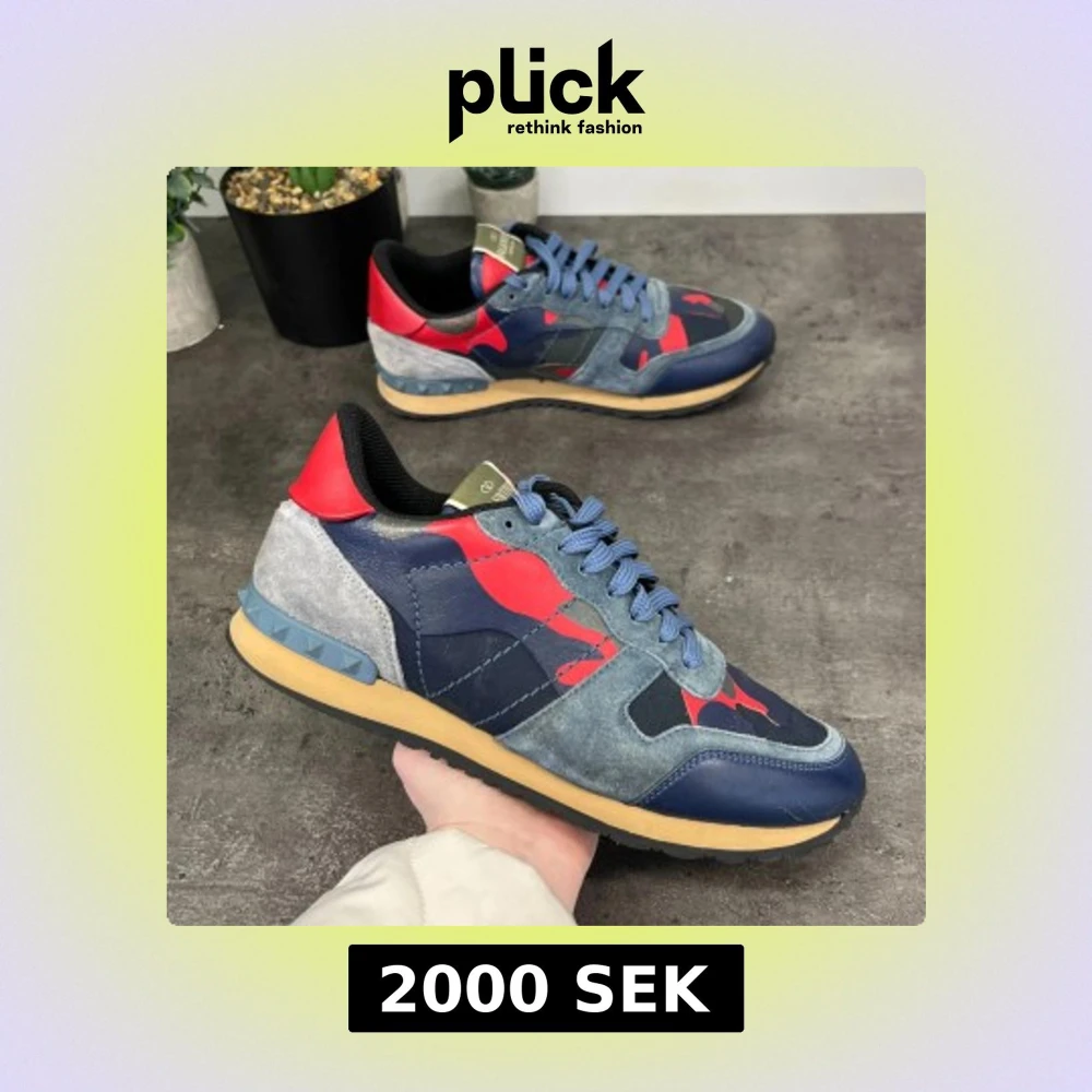 Snygga Valentino Rockrunner sneakers med ett coolt kamouflagemönster i blått, rött och grått. Skorna har snörning och en bekväm sula. Perfekta för att ge din outfit en unik touch.