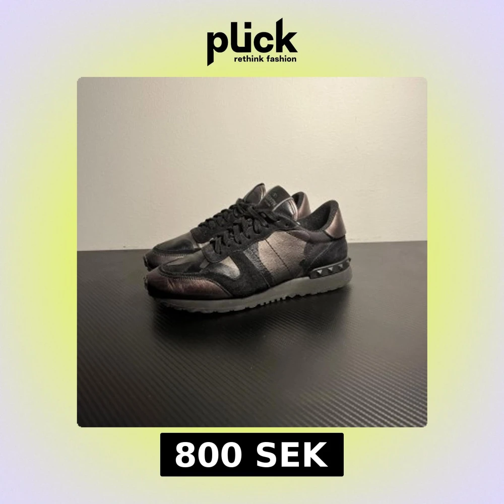 Snygga Valentino Garavani Rockrunner sneakers i svart och metallicgrå med coolt kamouflagemönster. Skorna har snörning, platt sula och ikoniska nitar på hälen. Materialmix av skinn och mocka ger en lyxig vibe och unik look.