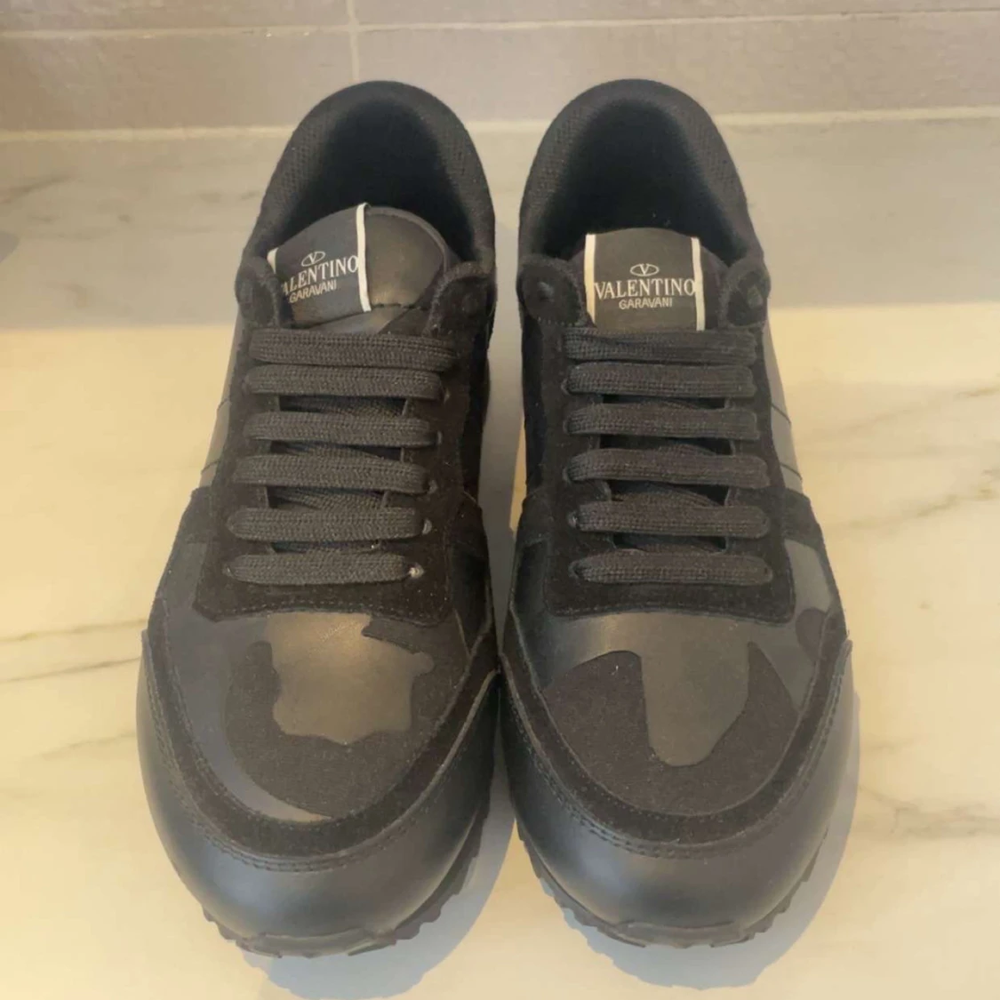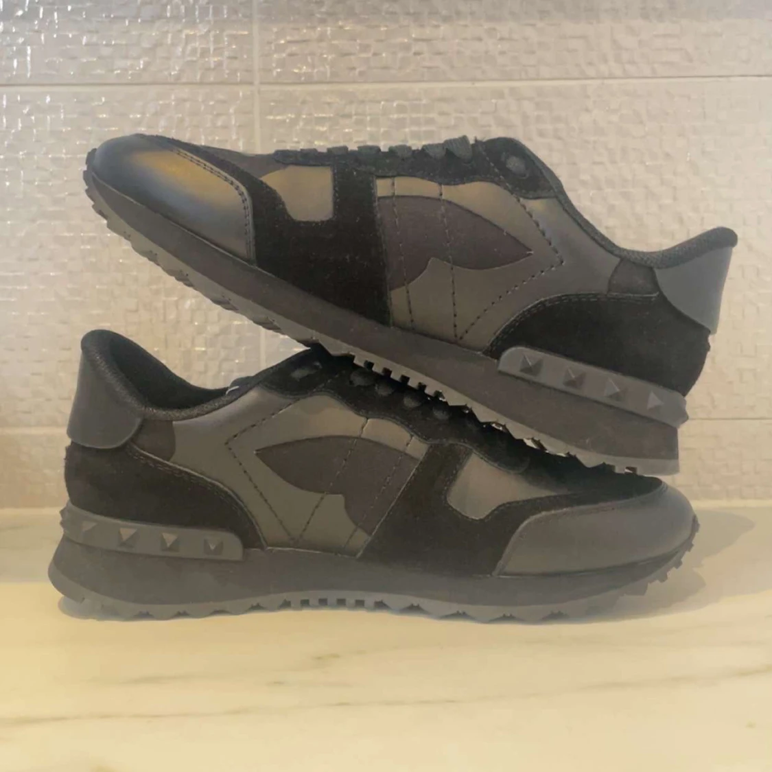 Säljer ett par svarta Valentino Rockrunner sneakers med kamouflagemönster. Skorna har svarta snören, rund tå och platt sula. Märkeslogga på plösen och detaljer i både mocka och skinn. Kommer med originalkartong.