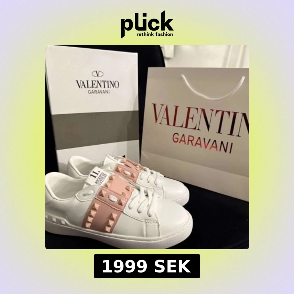 Säljer ett par Valentino Rockstud sneakers i vitt skinn med ljusrosa band och ikoniska nitar. Snygg och chunky sula med mönster, rund tå och klassisk snörning. Perfekta för dig som vill sticka ut med exklusiva detaljer och cool design.