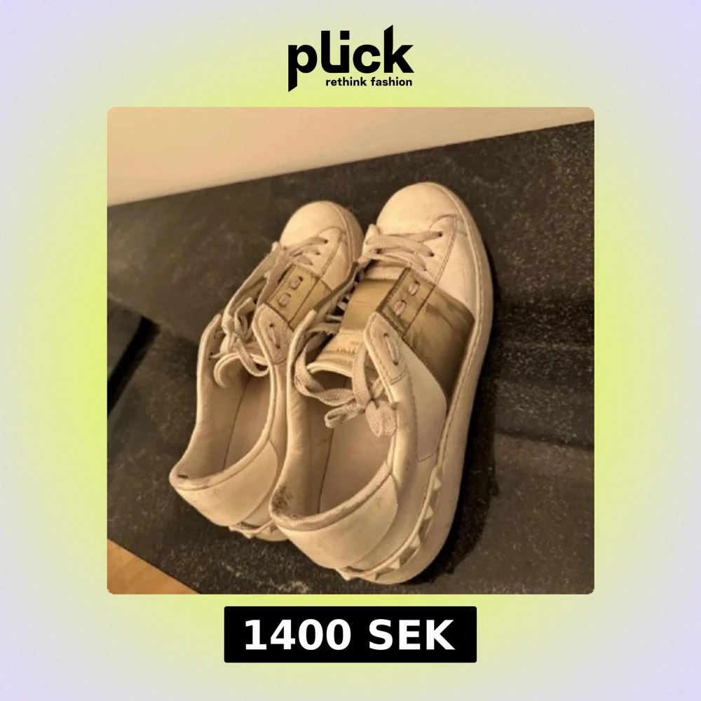 Snygga sneakers från Valentino Garavani i storlek 39. Skorna är vita med en bred guldig rem över mitten och har nitar längs sulan. Pris kan sänkas vid snabb affär. Hör av er vid intresse eller liknande!😁