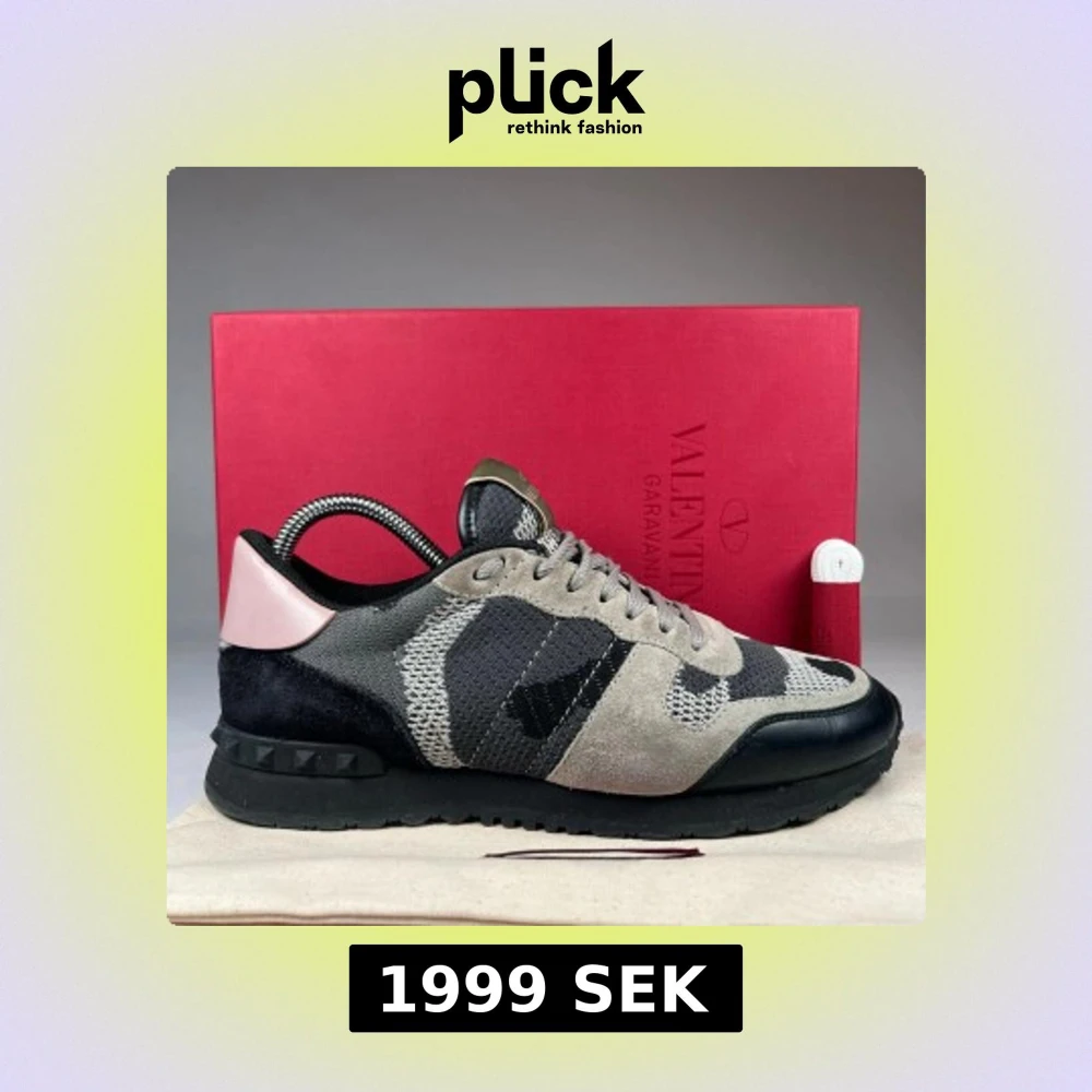 Säljer ett par Valentino Rockrunner sneakers med grått och svart camouflage-mönster. Skorna har detaljer i mocka och skinn, svart sula och en rosa detalj vid hälen. Med låda och allt. Pris kan diskuteras!