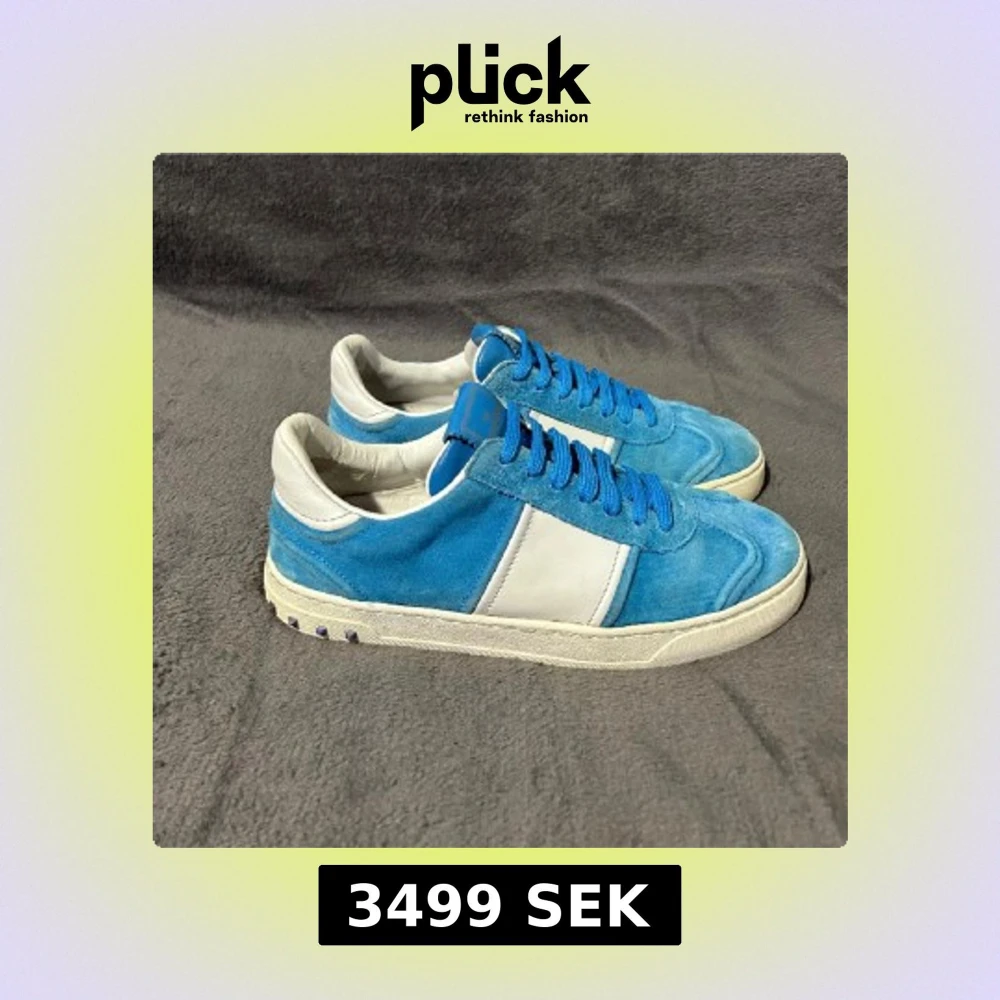 Snygga sneakers från Valentino Garavani i blå mocka med vita skinnpaneler och matchande blå skosnören. Skorna har rund tå, platt sula och coola nitar baktill på sulan för en extra edge. Kommer med originalkartong och extra skosnören.