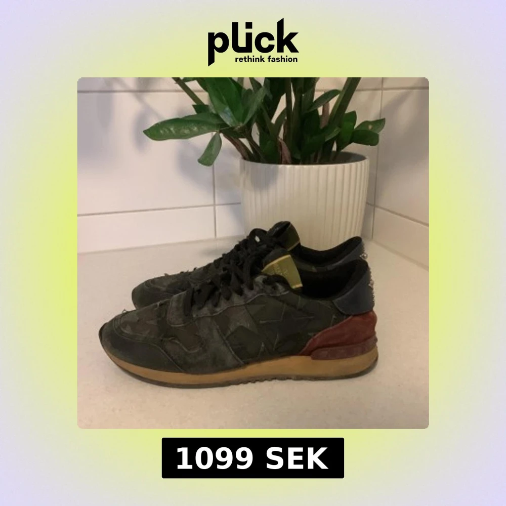 Snygga Valentino Rockrunner sneakers i svart med stjärnmönster och detaljer i mörkgrön och vinröd mocka. Skorna har snörning, platt sula och coola nitar med turkosa pärlor på hälen. Perfekt för dig som vill sticka ut med exklusiva och unika sneakers.