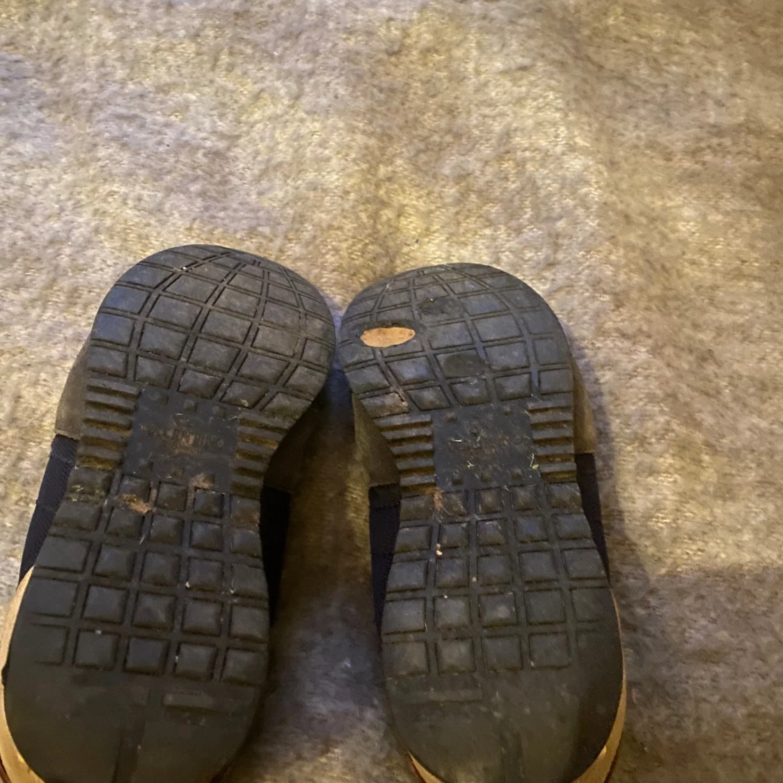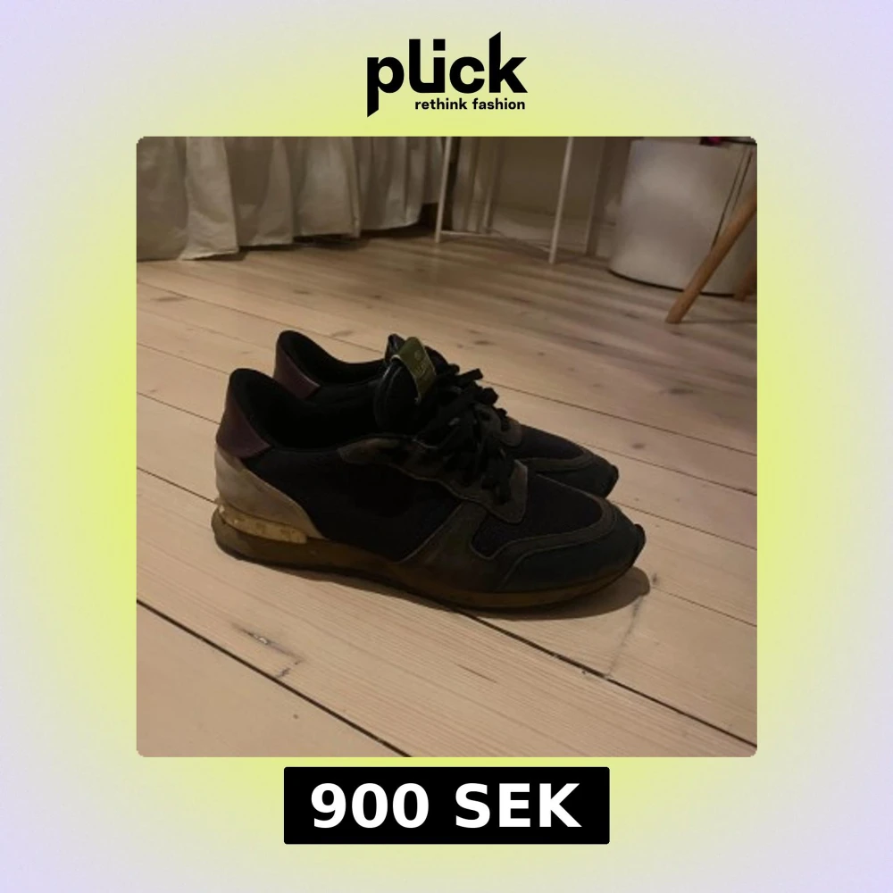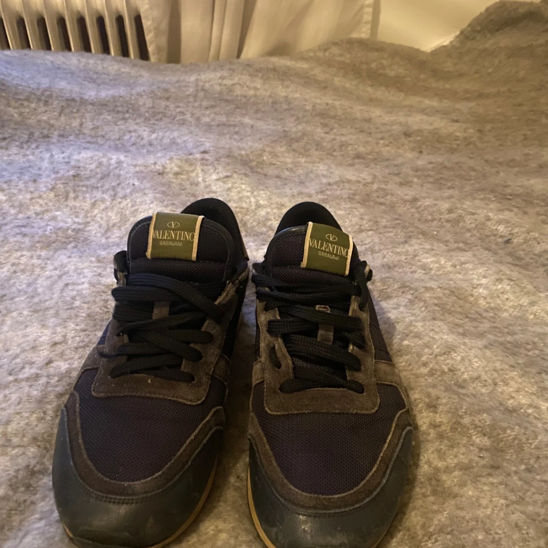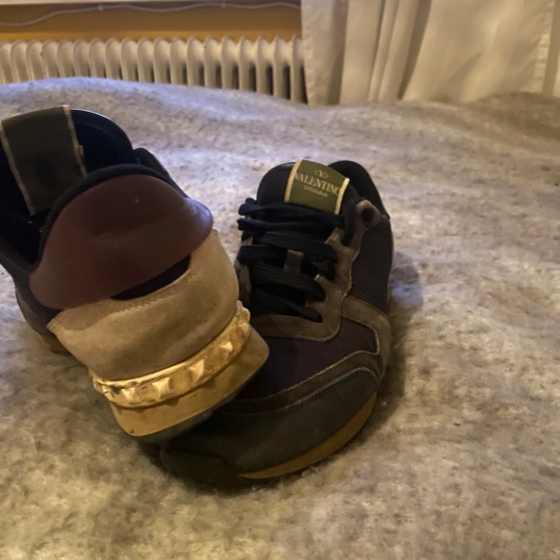 Säljer ett par Valentino Garavani Rockrunner sneakers i mörkblått och brunt med svarta snören. Skorna har detaljer i mocka och skinn, samt en beige och vinröd häl med guldtonad plattform. Klassisk rund tå och platt sula. Perfekt för dig som gillar exklusiva streetwear-vibes. Litet hål på sulan som ni ser på sista sidan.