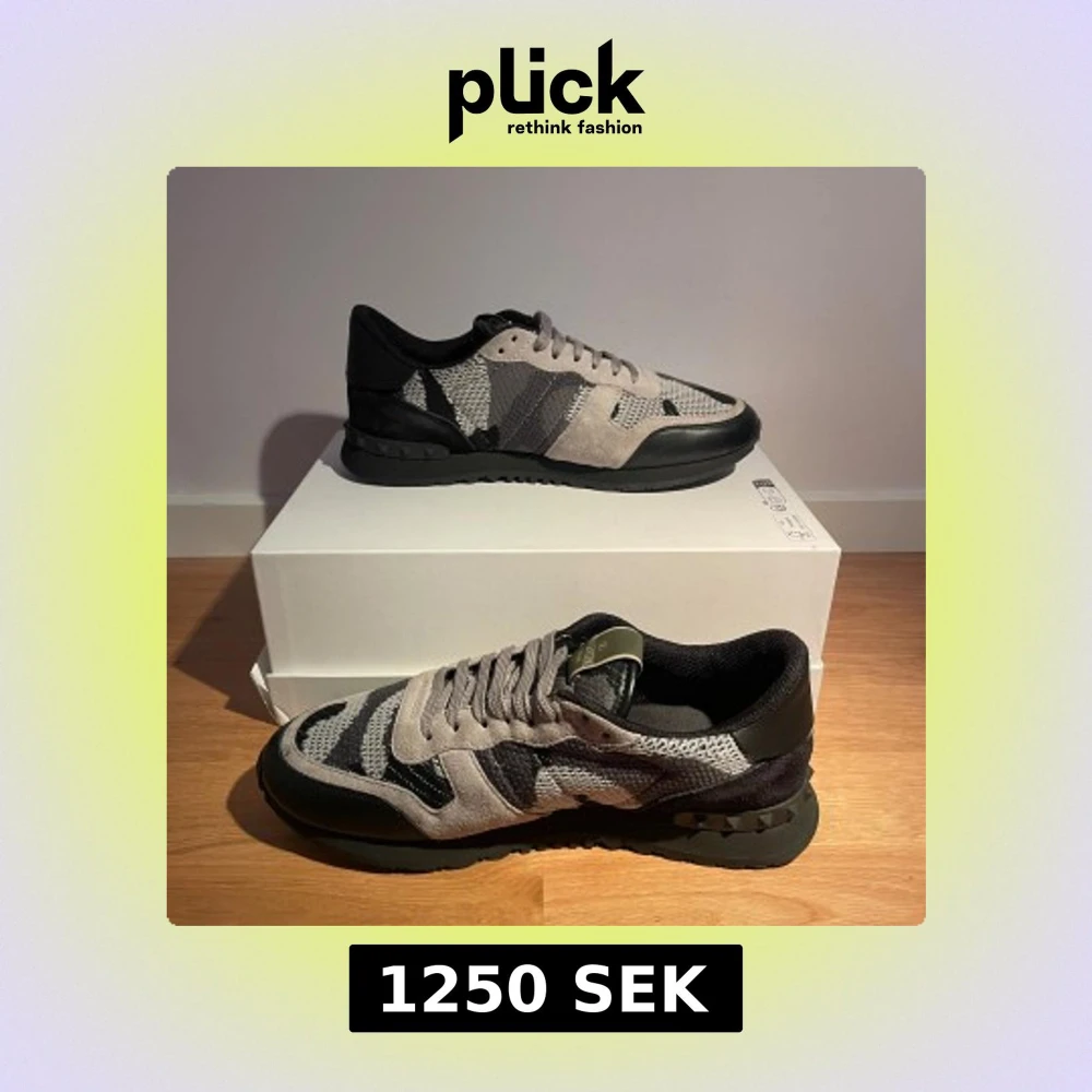 Snygga Valentino Garavani Rockrunner sneakers i svart, grått och beige med coolt camouflage-mönster. Skorna har snörning, platt sula och detaljer i mocka och textil.