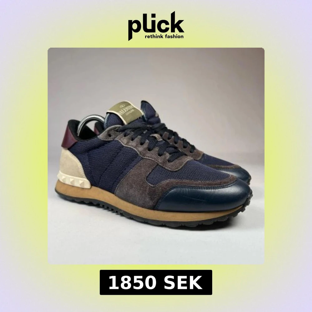 Snygga Valentino Rockrunner sneakers med ovandel i blå mesh, mörkgrå mockadetaljer och beige häl med nitar. Skorna har svarta snören, bruna och svarta detaljer samt platt sula. Perfekta för dig som gillar exklusiva och sportiga sneakers.