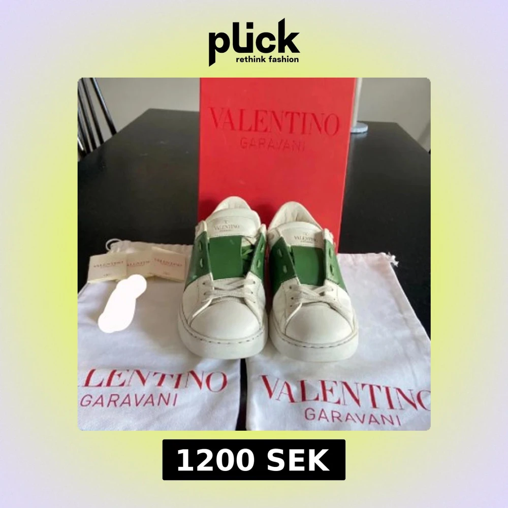 Snygga Valentino Garavani Open sneakers i vitt skinn med grön panel och ikoniska nitar på hälen. Klassisk rund tå, platt sula och snörning. Kommer med originalpåse och box. Perfekta för dig som vill sticka ut med lyxig streetstyle. Välj mellan 2 boxar en vit eller röd, allt på bilden följer med även en valentino påse att lägga skorna/ sulan har lossnat framme(kolla sista bilden) går att laga för billig peng,