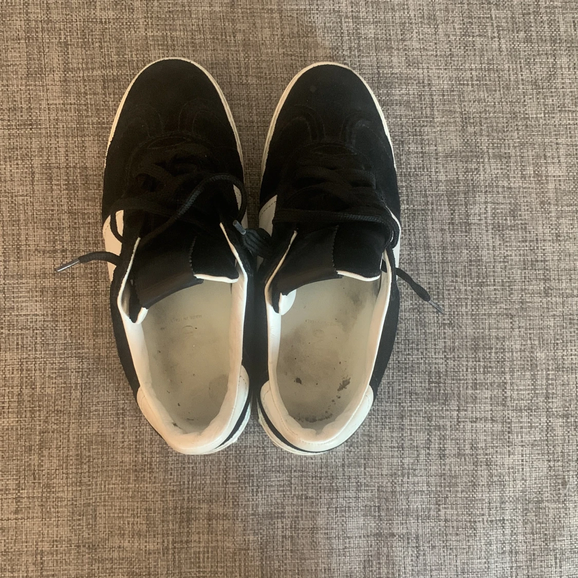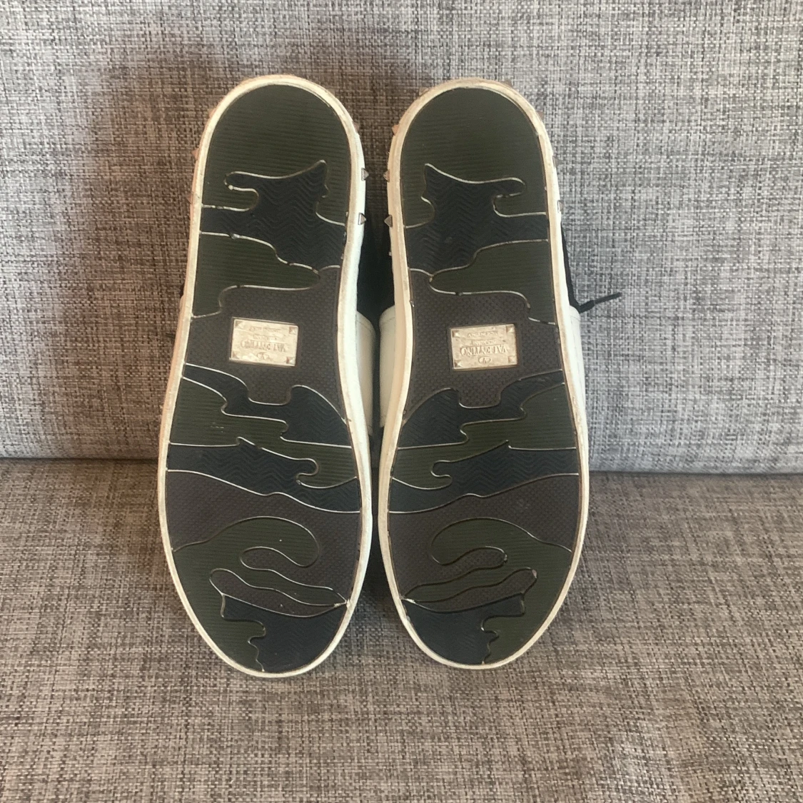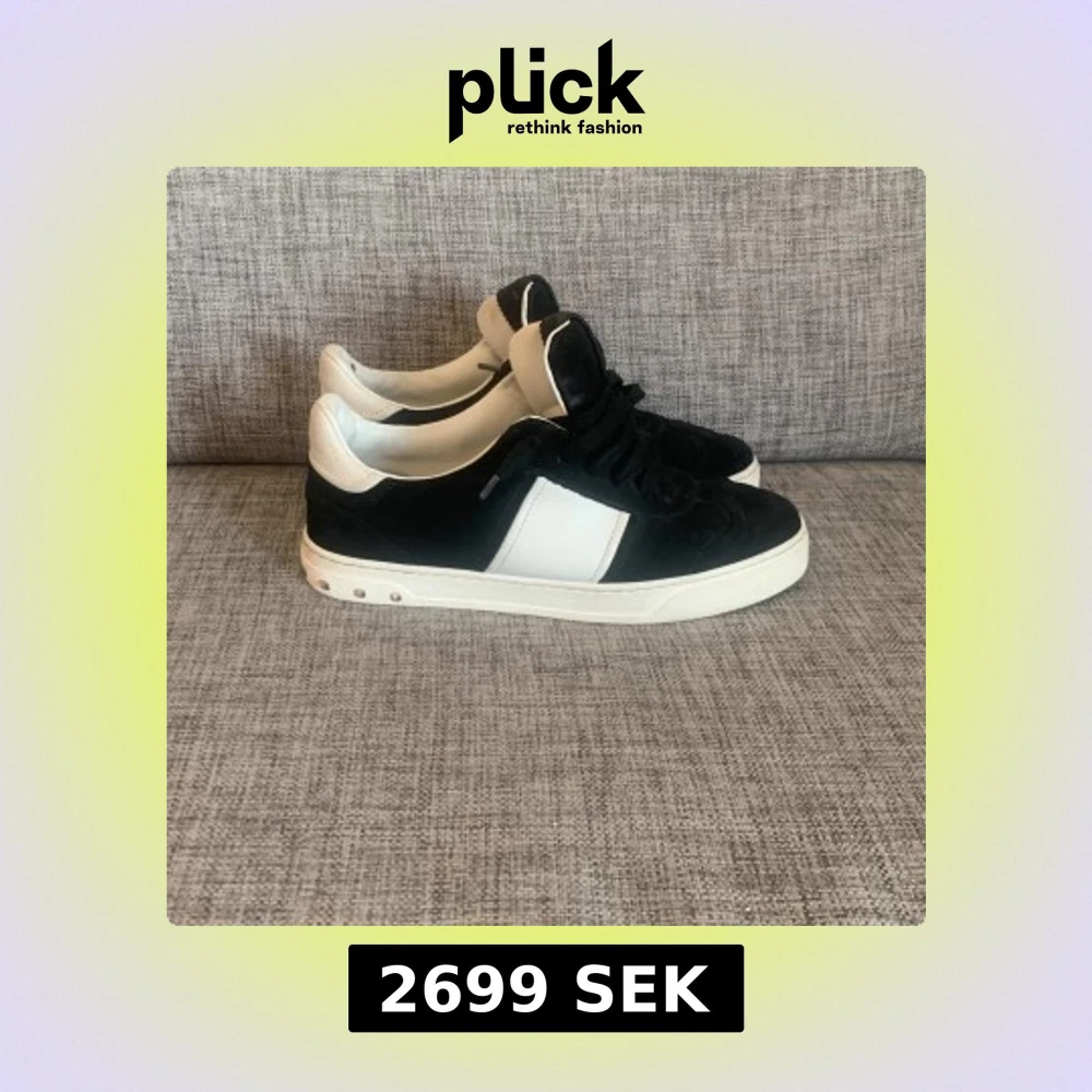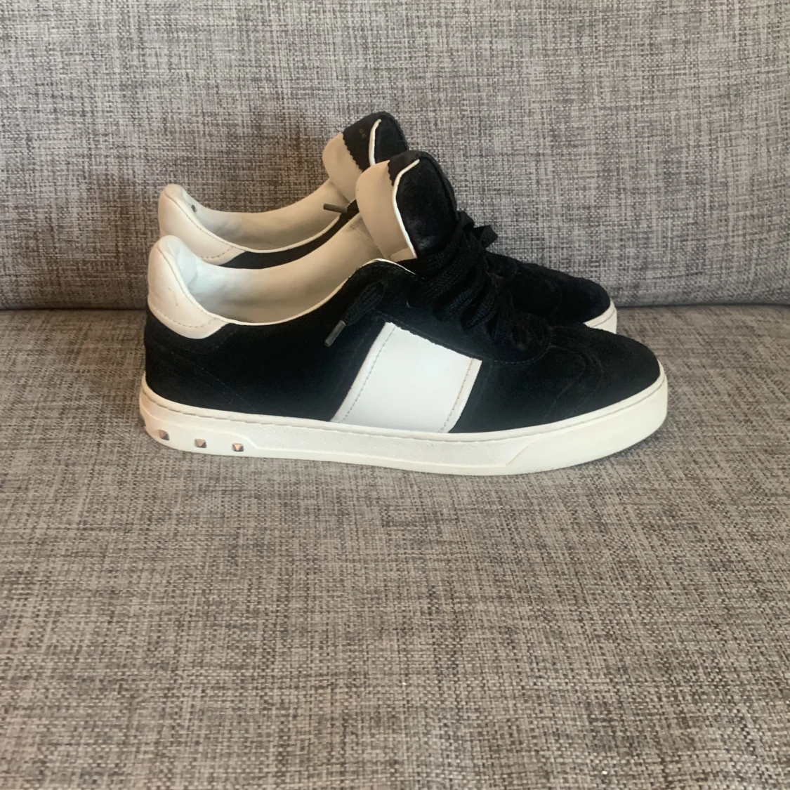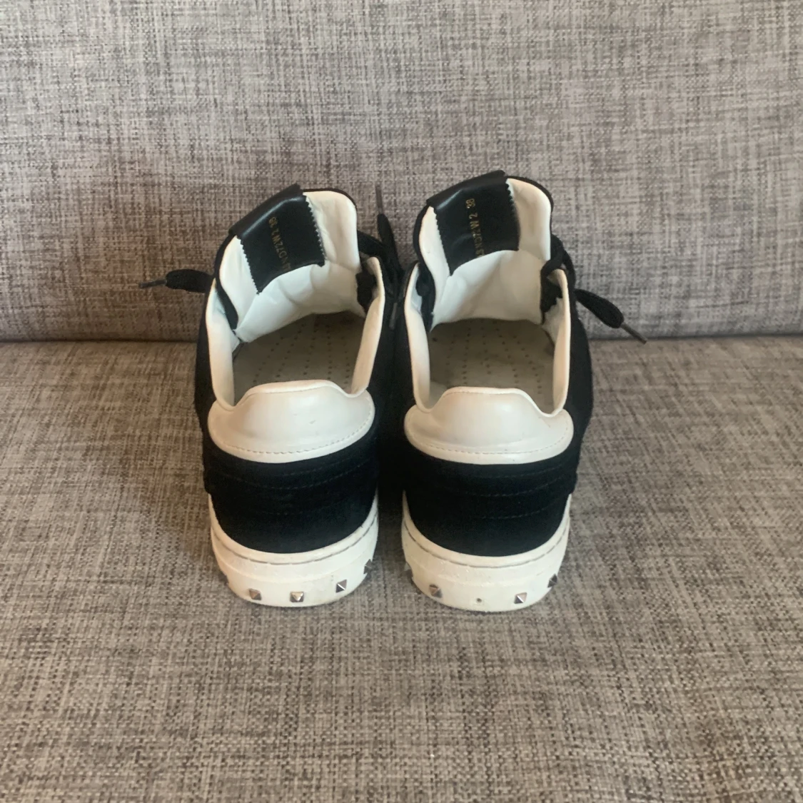 Svarta och vita Valentino Rockstud sneakers i mocka och skinn med klassiska nitar på hälen. Snygg kontrast mellan svart ovandel och vita detaljer, samt cool sula med mönster undertill. Perfekta för dig som gillar exklusiva och trendiga sneakers. Priset går att diskutera vid en snabb affär