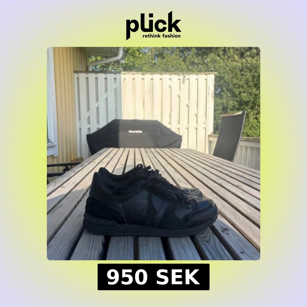 Snygga helsvarta Valentino Rockrunner sneakers med coola nitar på hälen. Skorna har en mix av skinn och mocka, klassisk snörning och platt sula. Perfekta för dig som gillar en stilren och edgy look.