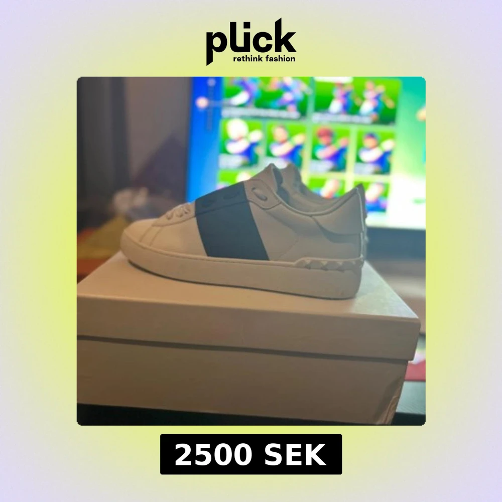 Snygga Valentino Garavani Open sneakers i vitt skinn med bred blå rem över mitten. Klassisk rund tå, vita snören och ikoniska nitar baktill på sulan. Perfekta för dig som vill ha en clean men lyxig look. Skriv vid intresse pris kan diskuteras