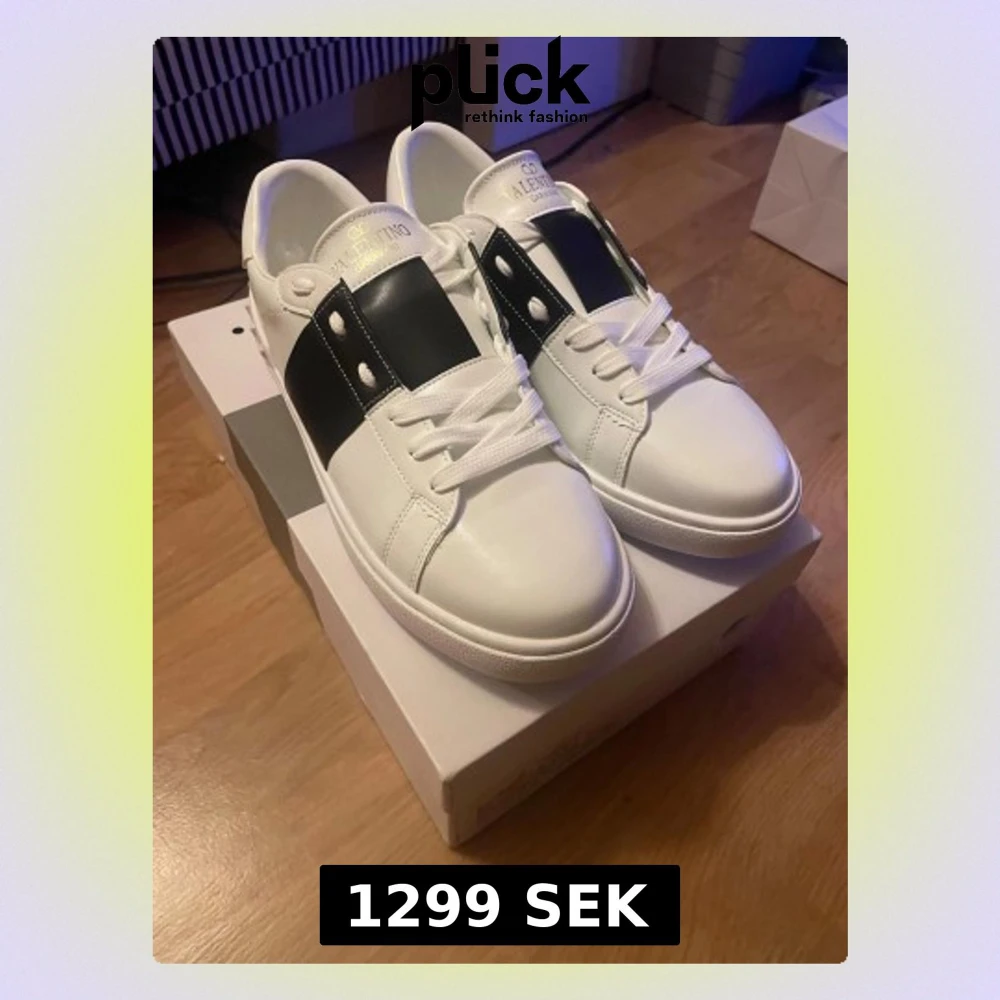 Snygga vita sneakers från Valentino Garavani med bred svart rem över ovansidan och coola nitar på hälen. Skorna har rund tå, platt sula och klassisk snörning. Tillverkade i slätt skinn med vita och svarta detaljer som ger en stilren och modern vibe. Sprillans nya bara testade, kan pruta ned lite!