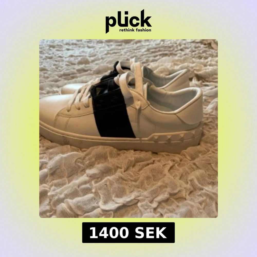 Säljer ett par vita Valentino sneakers med en bred svart rem över mitten och nitar längs sulan. Skorna har rund tå och platt sula, samt klassisk snörning. Perfekta för dig som gillar stilrena men ändå unika skor. I princip nya, sällan använda.