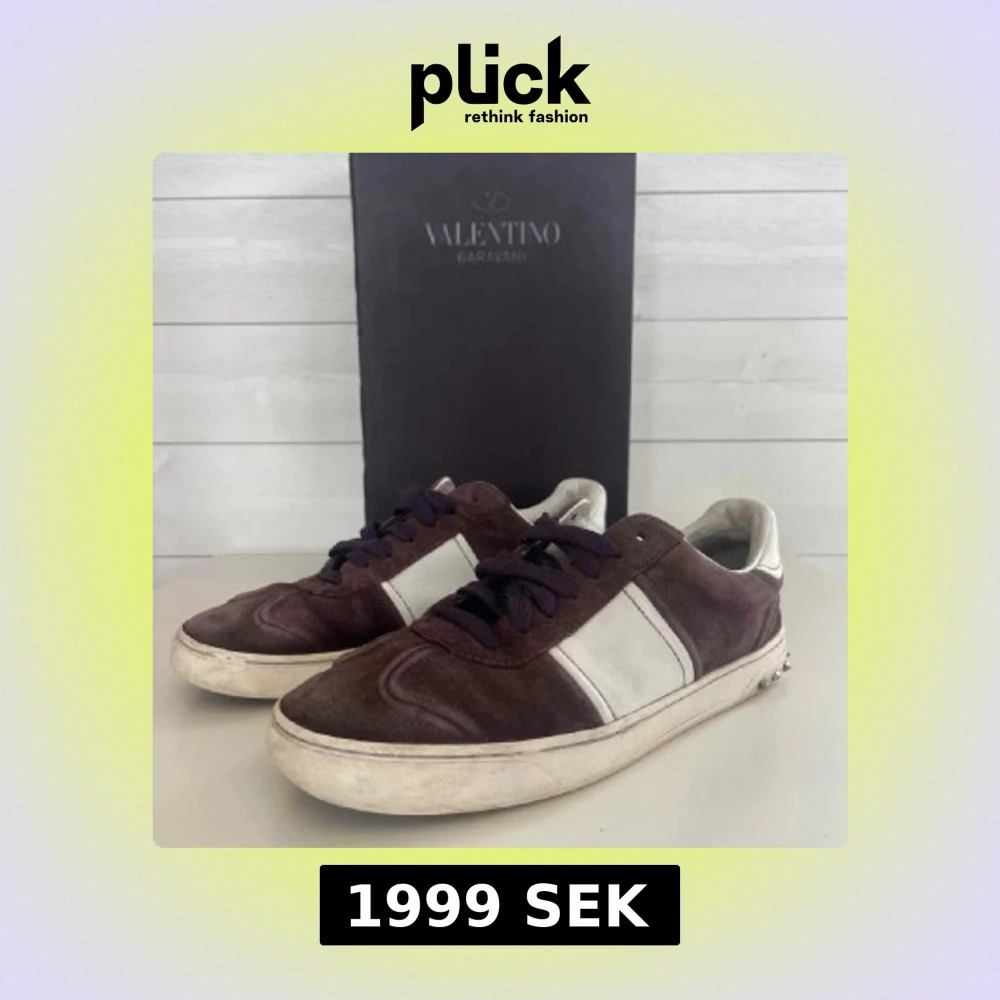 Snygga sneakers från Valentino Garavani i brun mocka med vita detaljer och bred vit rand på sidorna. Skorna har mörka snören och klassisk låg profil. Perfekta för dig som gillar exklusiva och stilrena sneakers med en lyxig känsla.
