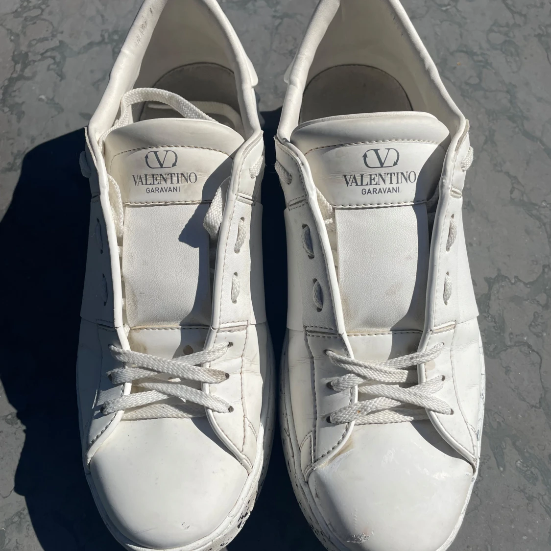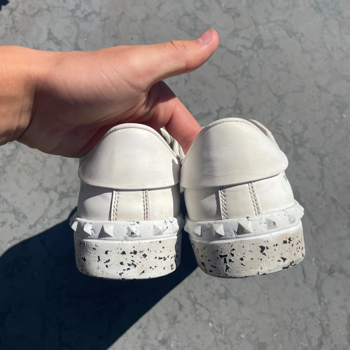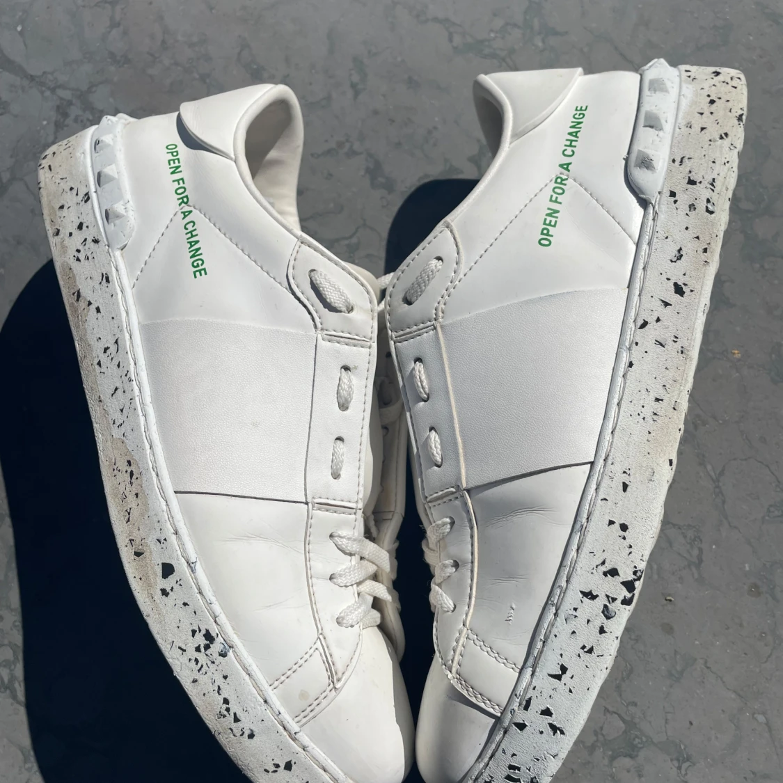 Säljer ett par vita Valentino Garavani sneakers med coola svarta stänk på sulan och texten 'OPEN FOR A CHANGE' i grönt på sidan. Skorna har snörning, platt sula och detaljerade nitar baktill. Tillverkade i skinn för en lyxig känsla och stilren look.