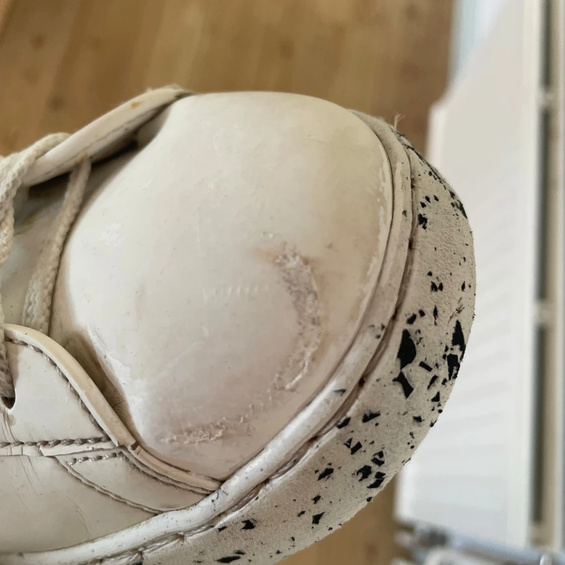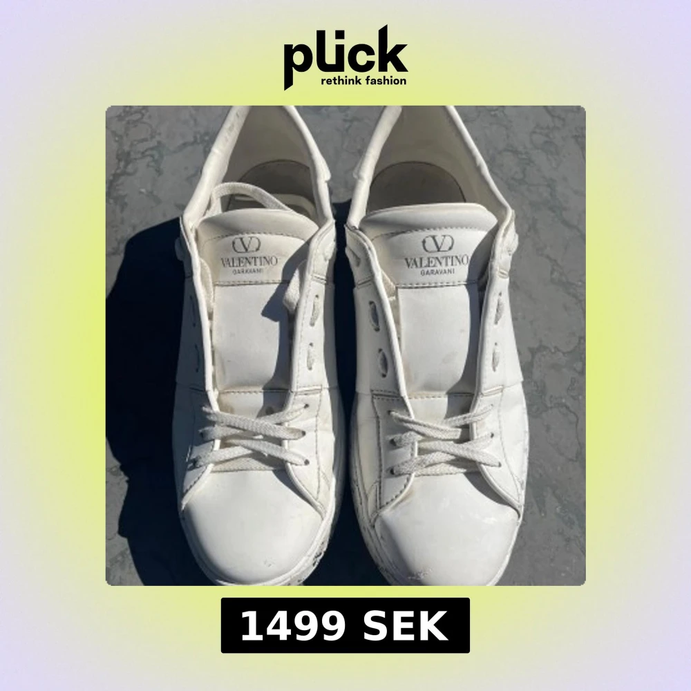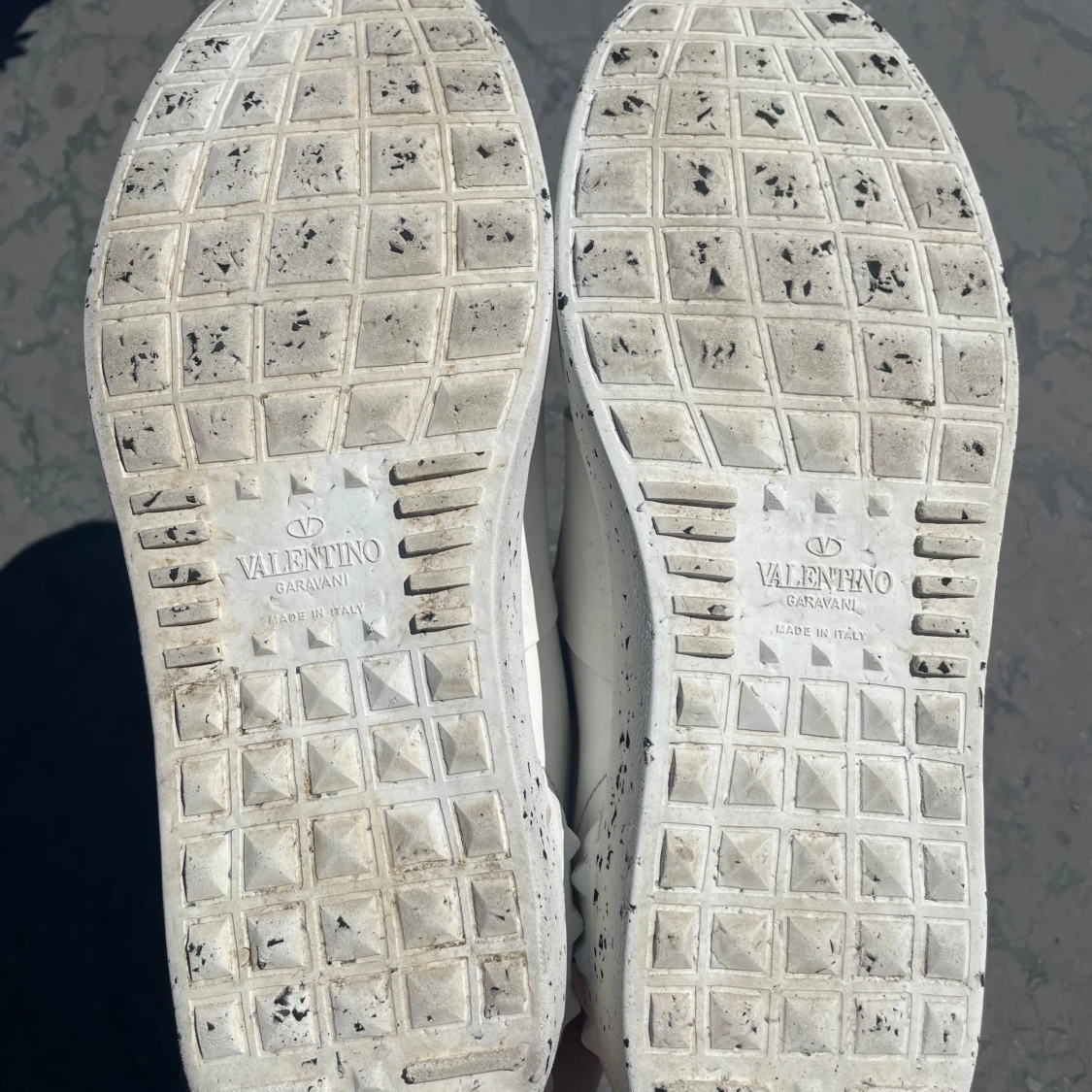 Säljer ett par vita Valentino Garavani sneakers med coola svarta stänk på sulan och texten 'OPEN FOR A CHANGE' i grönt på sidan. Skorna har snörning, platt sula och detaljerade nitar baktill. Tillverkade i skinn för en lyxig känsla och stilren look.