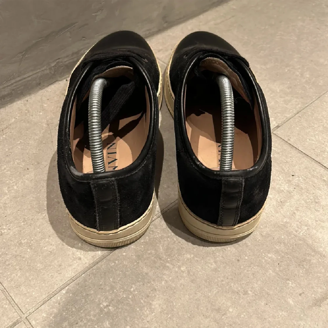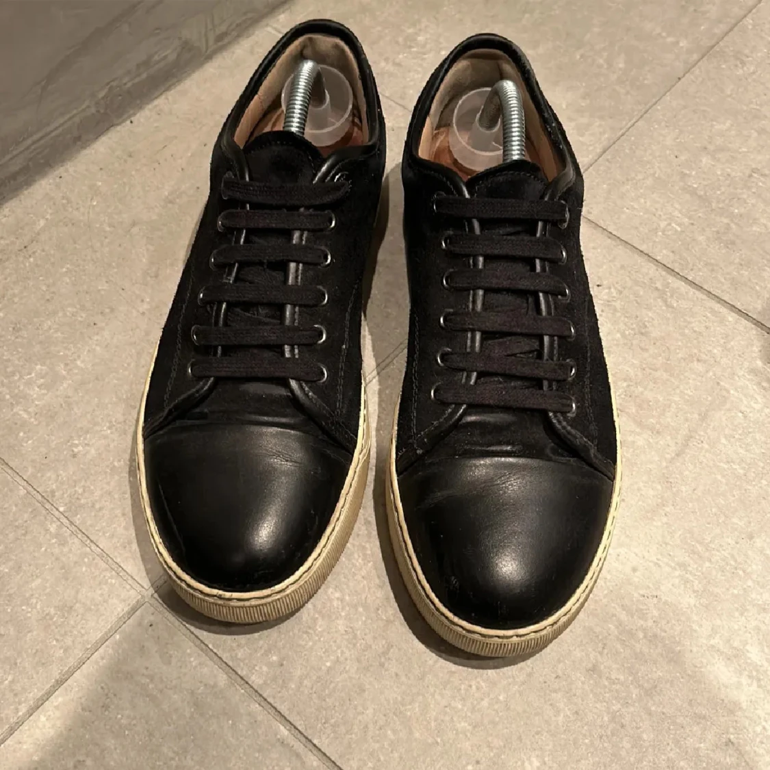 Snygga svarta sneakers från Lanvin med snörning och en stilren design. Skorna har en kombination av skinn och mocka vilket ger en lyxig känsla. Perfekta för en trendig look. Jävligt laidback.