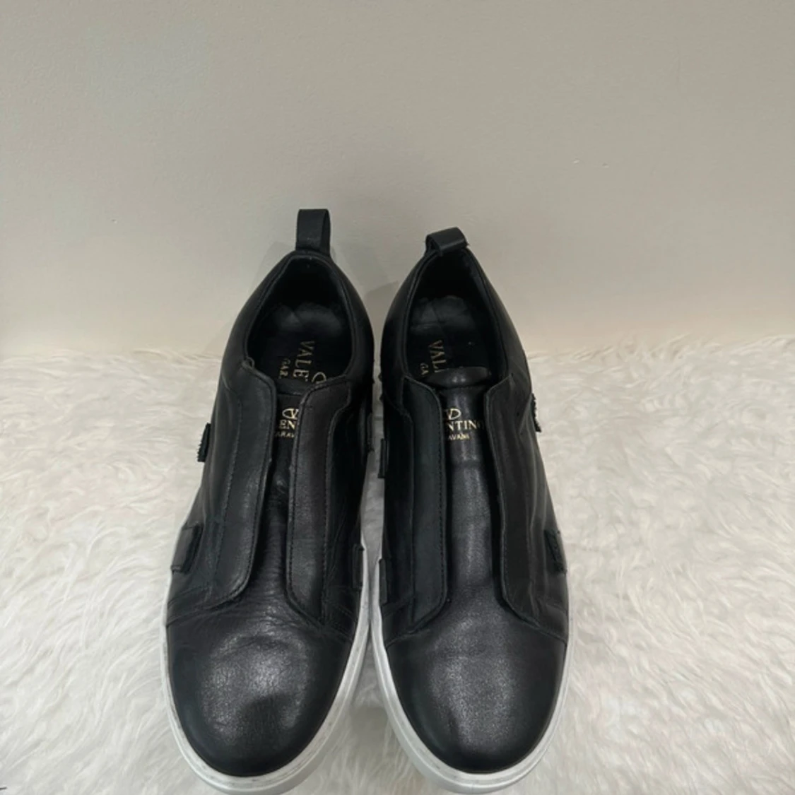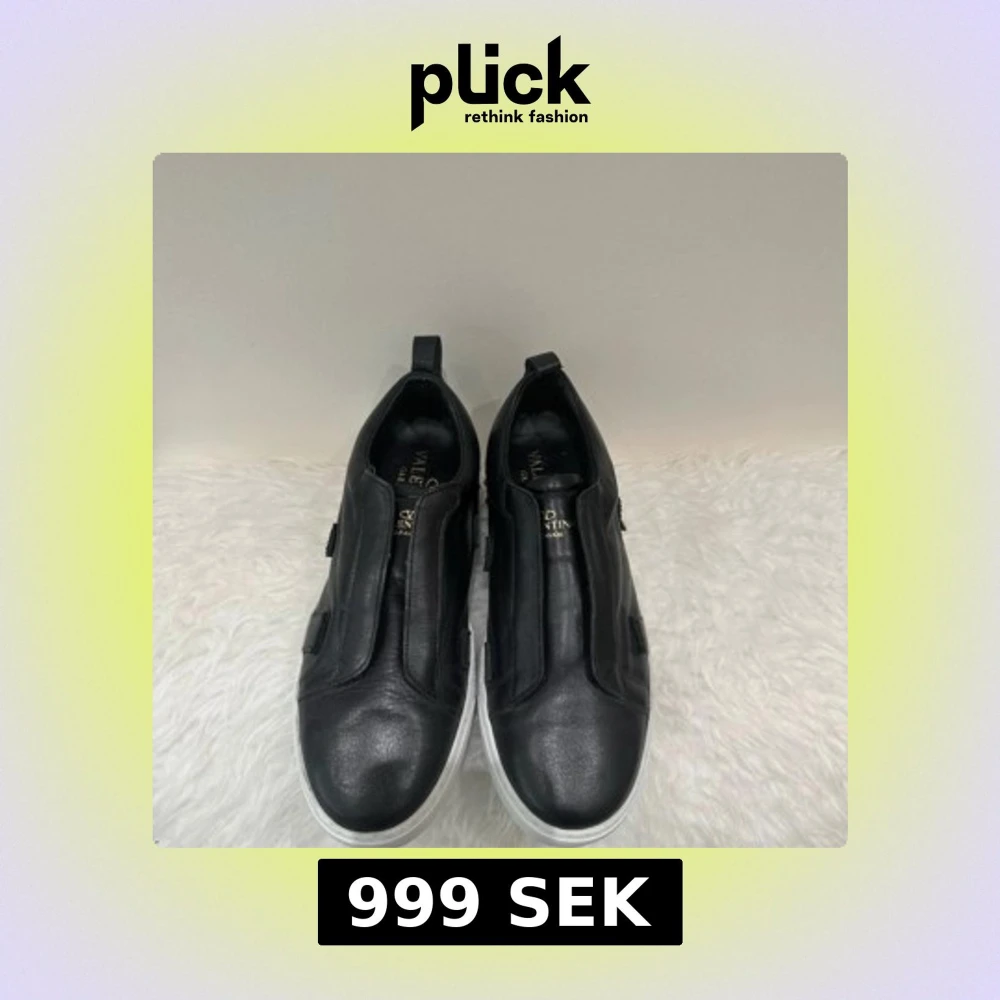 Svarta sneakers från Valentino Garavani i skinn med vita sulor dekorerade med små nitar runtom. Snygg minimalistisk design utan snörning och med rund tå. Perfekta för dig som gillar lyxiga och stilrena skor med en edgy touch.