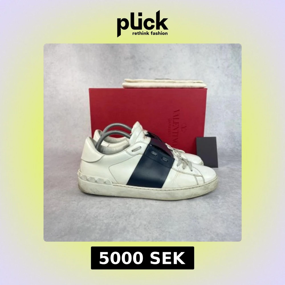 Snygga Valentino sneakers i vitt med en bred blå rand. Skorna har klassisk snörning och dekorativa nitar runt hälen. Perfekta för en stilren look.
