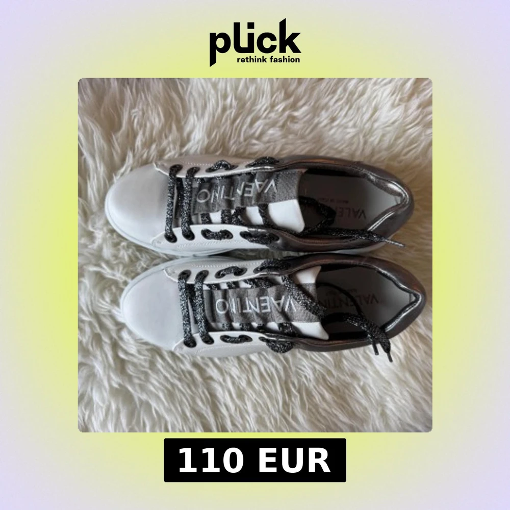 Snygga Valentino sneakers i vitt skinn med metallic-silver detaljer och glittriga svarta snören.