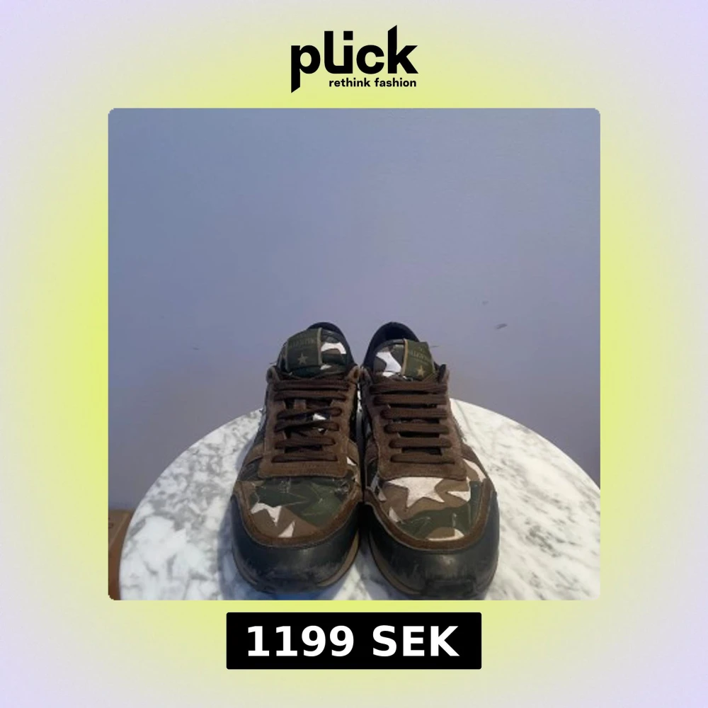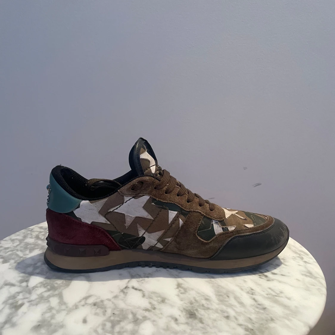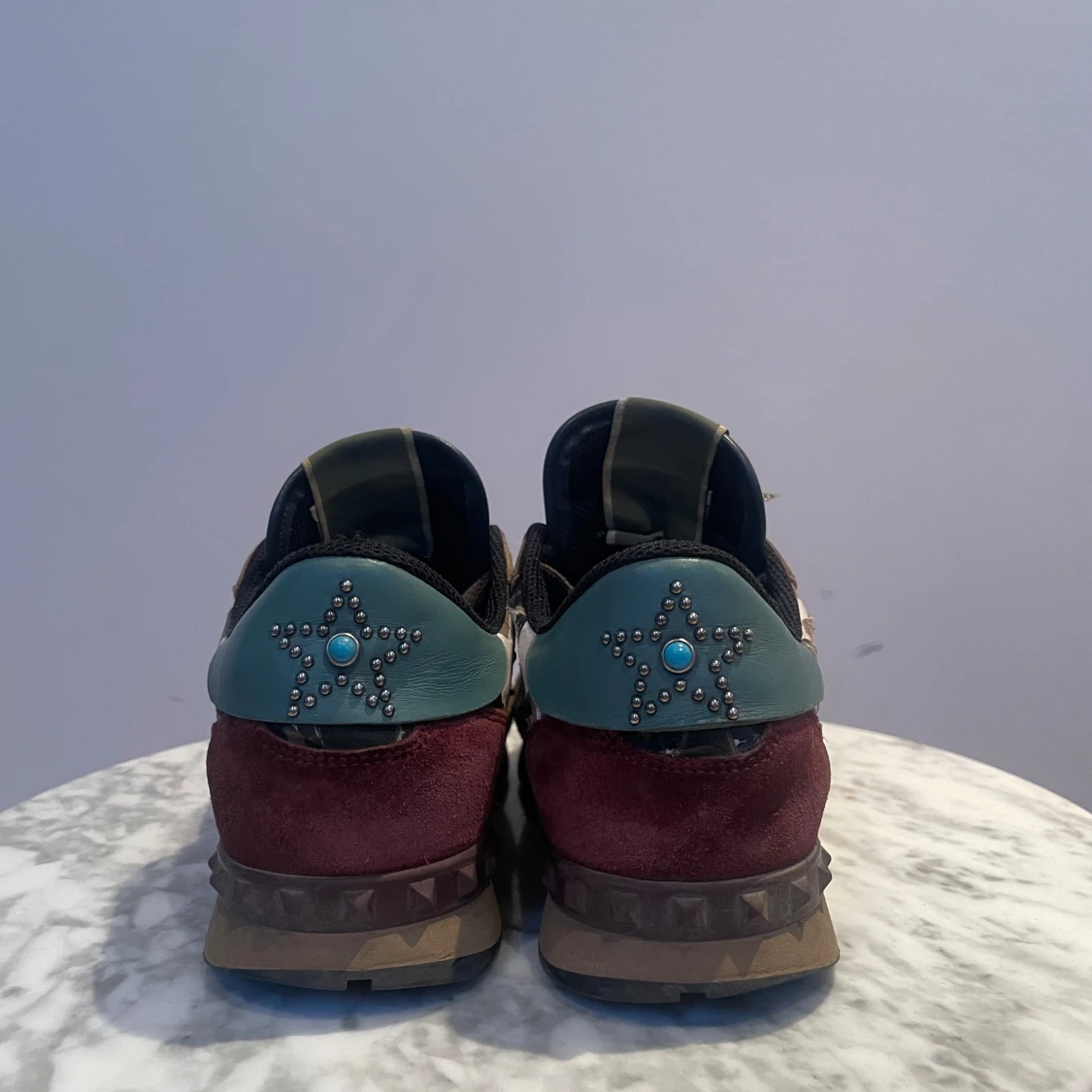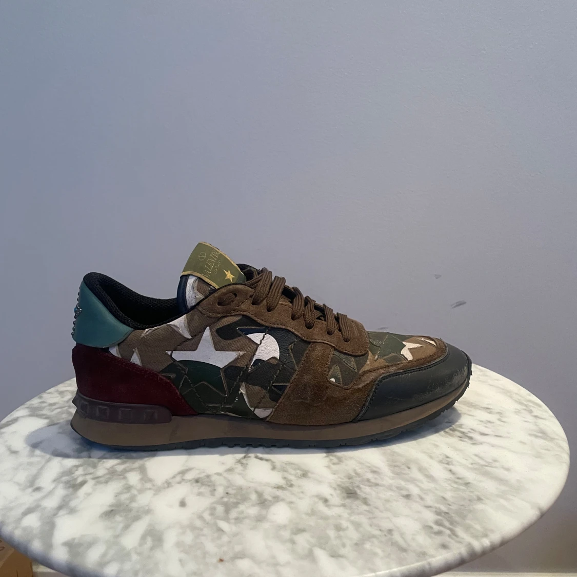 Snygga Valentino Rockrunner sneakers i ett coolt camouflagemönster med stjärndetaljer. Skorna har en kombination av gröna, bruna och svarta nyanser med en unik stjärna på hälen. Perfekta för att ge din outfit en edgy touch.