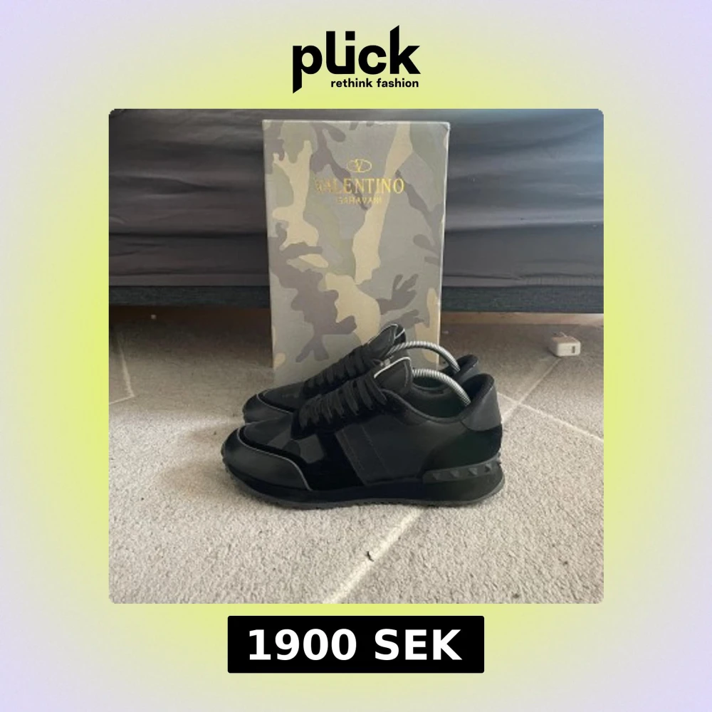 Säljer ett par svarta Valentino Garavani sneakers med matta och blanka partier samt diskret camouflage-mönster. Skorna har snörning och rund tå, och levereras med originalkartong i camouflage-design.