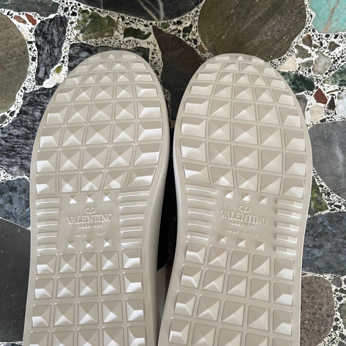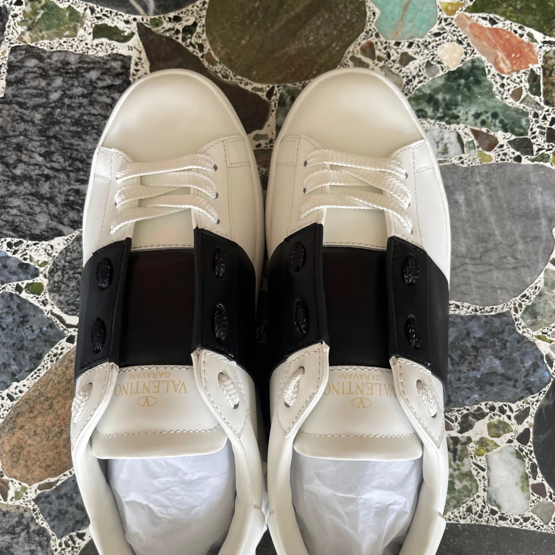 Snygga Valentino Garavani Open sneakers i vitt skinn med bred svart läderdetalj över snörningen. Klassisk rund tå, platt sula med nitar och diskret logga på plösen och sulan. Perfekta för dig som gillar lyxiga och stilrena sneakers.