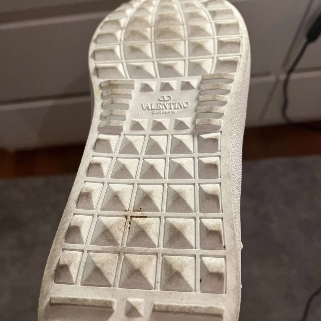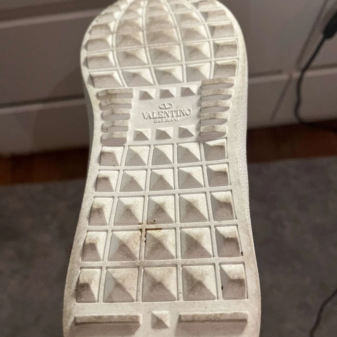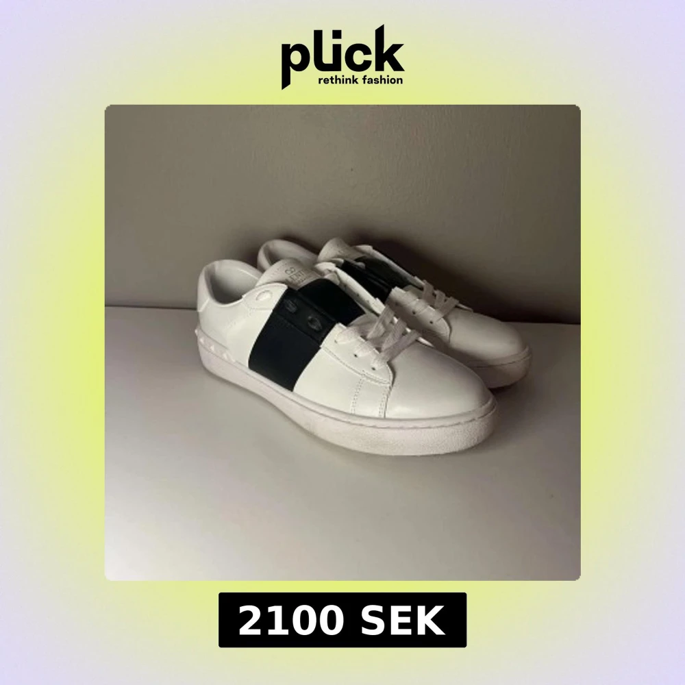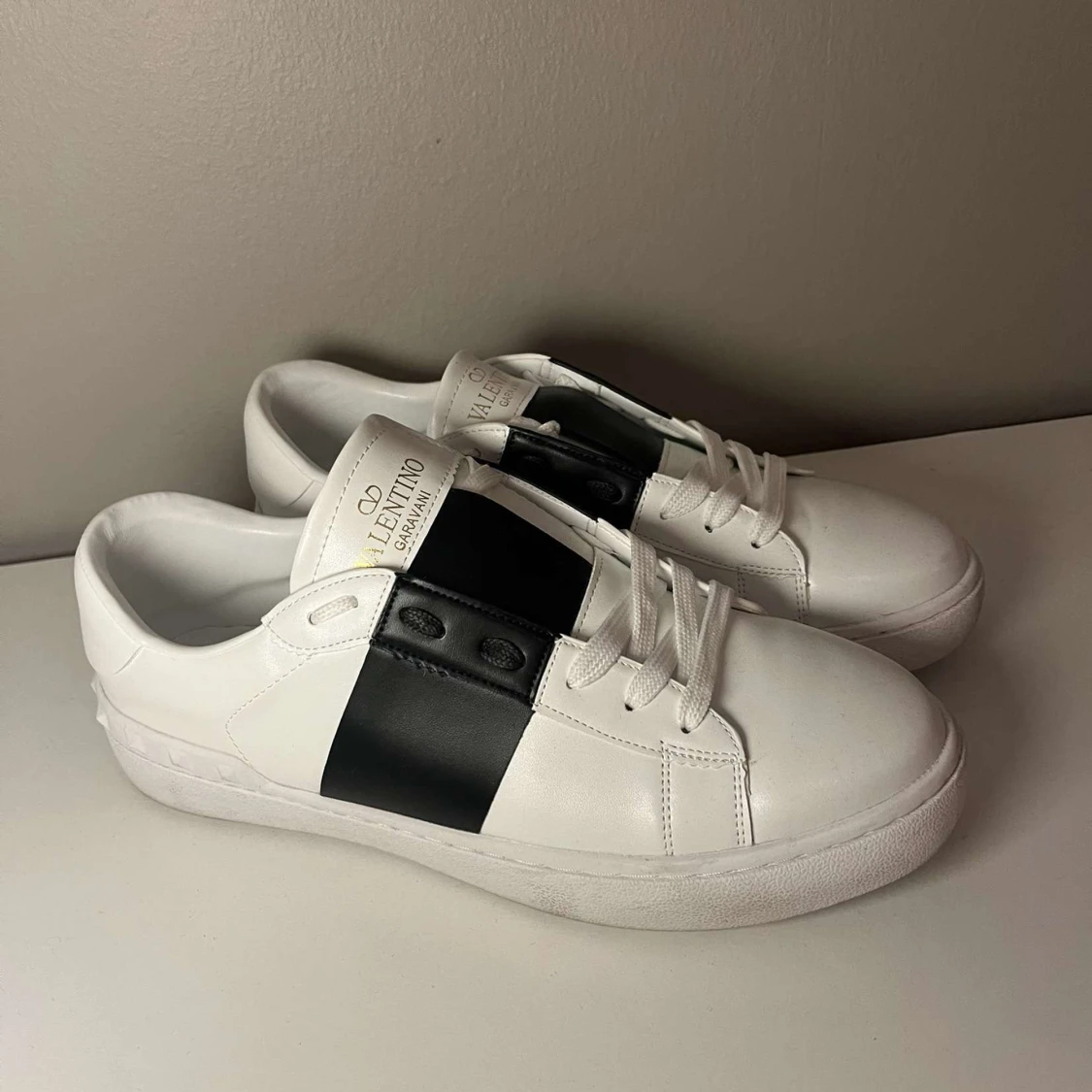 Snygga Valentino Garavani Open sneakers i vitt skinn med bred svart läderdetalj över vristen. Klassisk rund tå, vita snören och ikoniska nitar längs hälen. Perfekta för dig som gillar stilrena och lyxiga sneakers med en twist.
