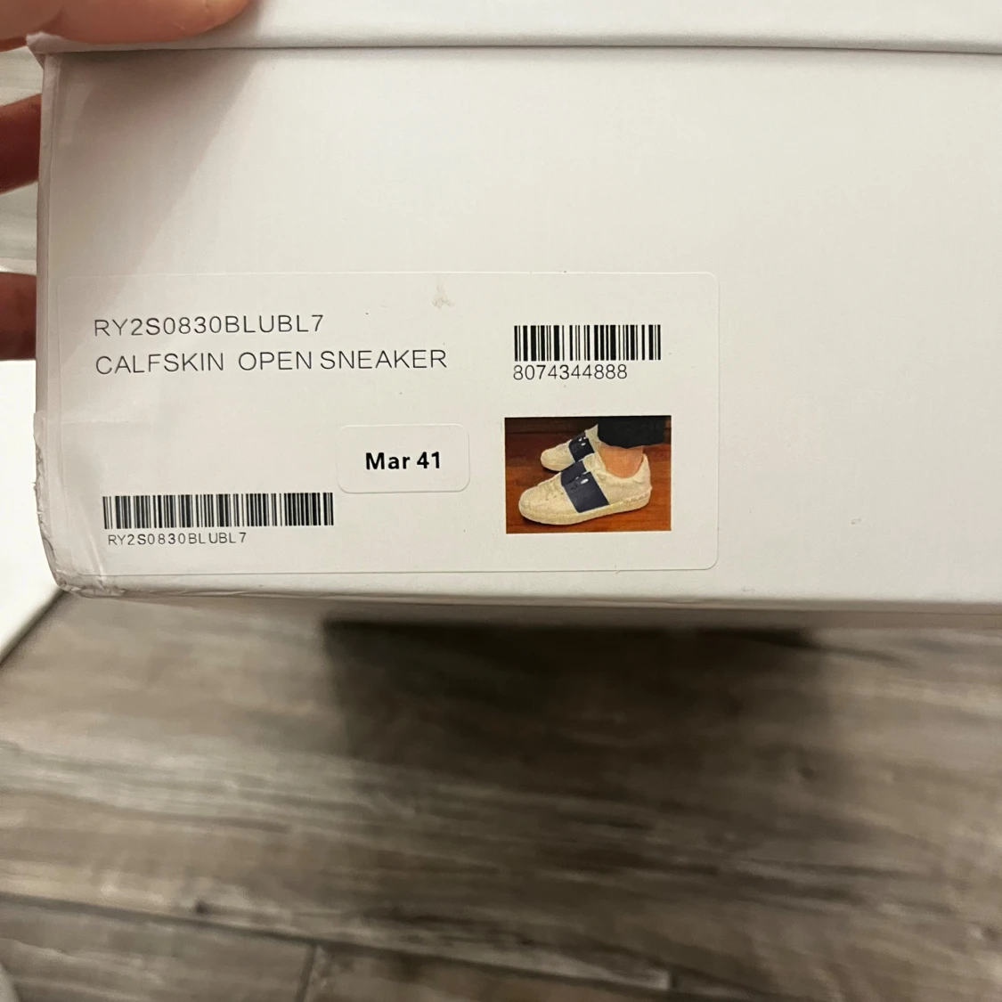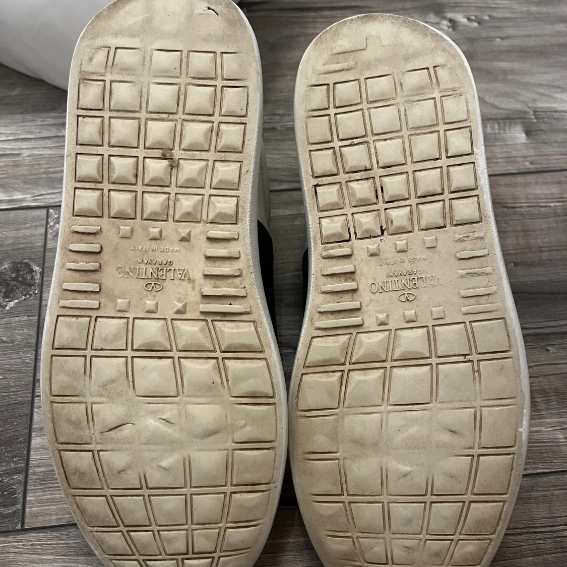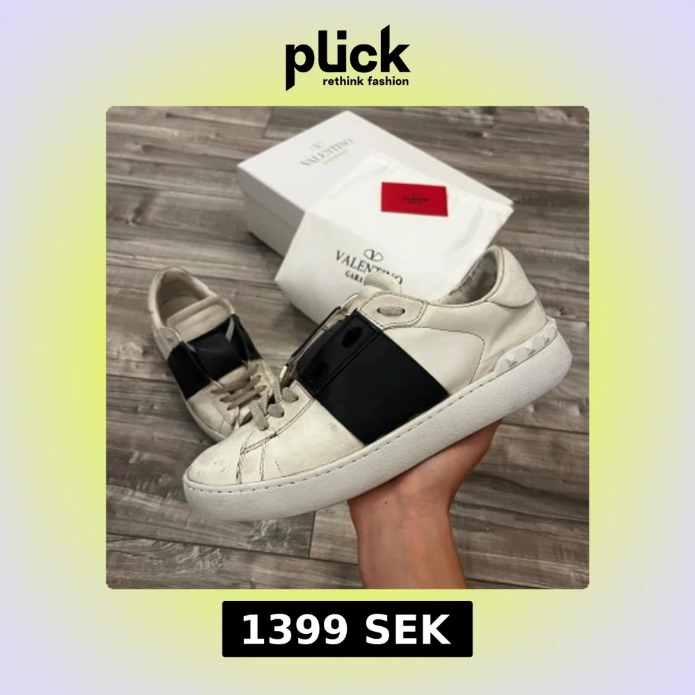 Snygga Valentino Garavani Open sneakers i vitt kalvskinn med en bred svart läderdetalj över mitten. Klassisk rund tå, platt vit sula och diskreta nitar baktill. Perfekta för dig som gillar lyxiga och stilrena sneakers med en unik touch.