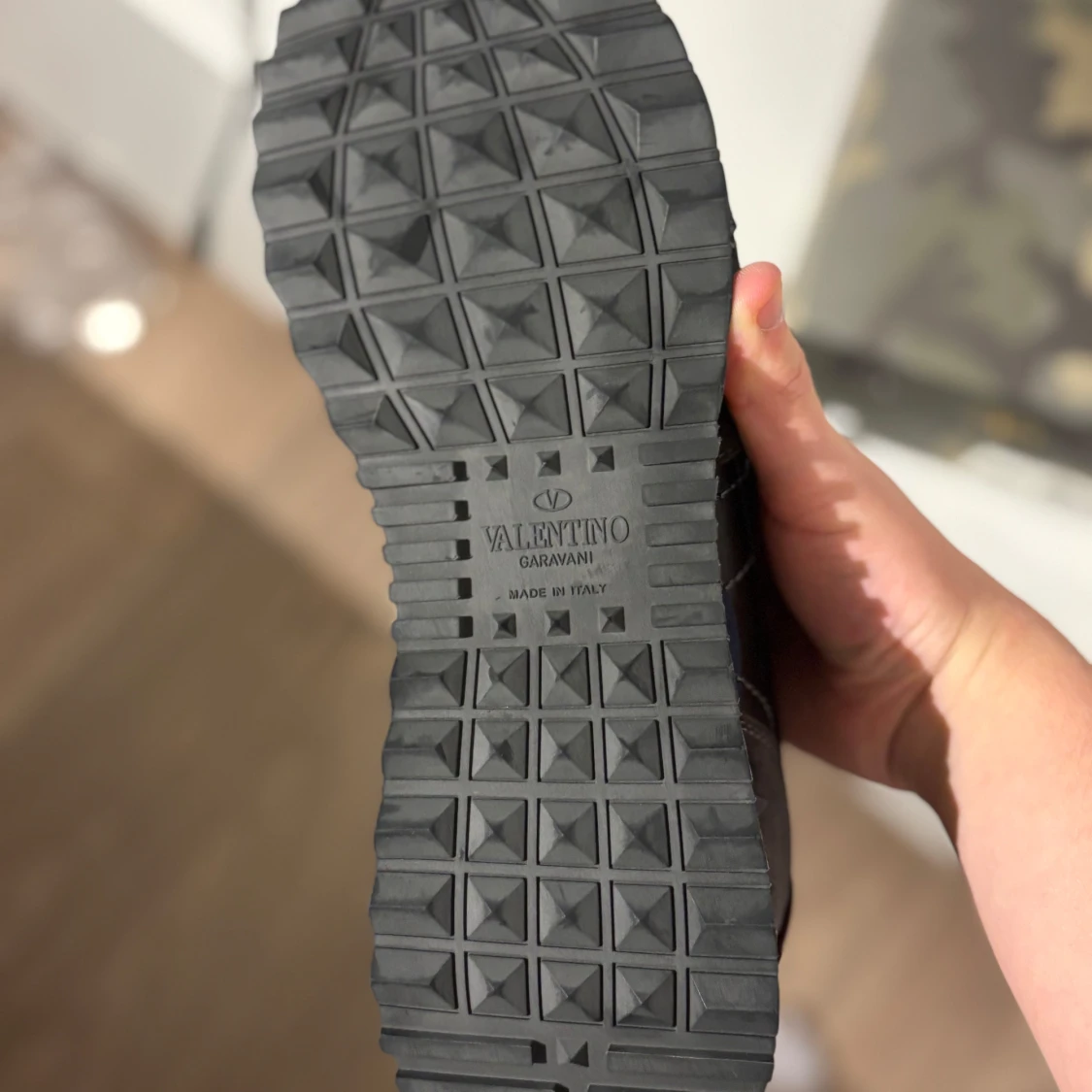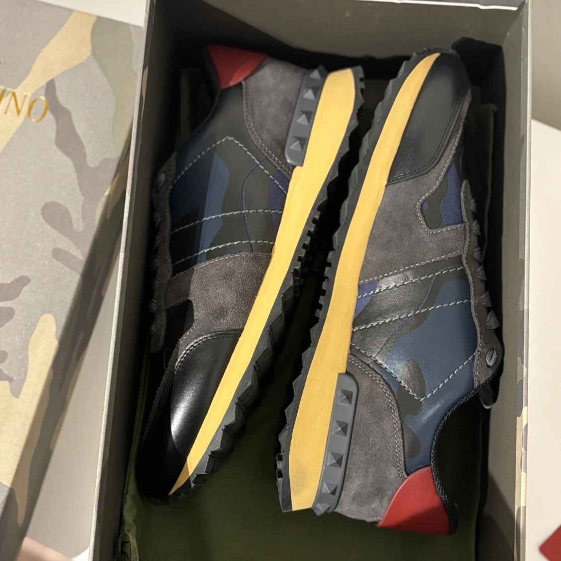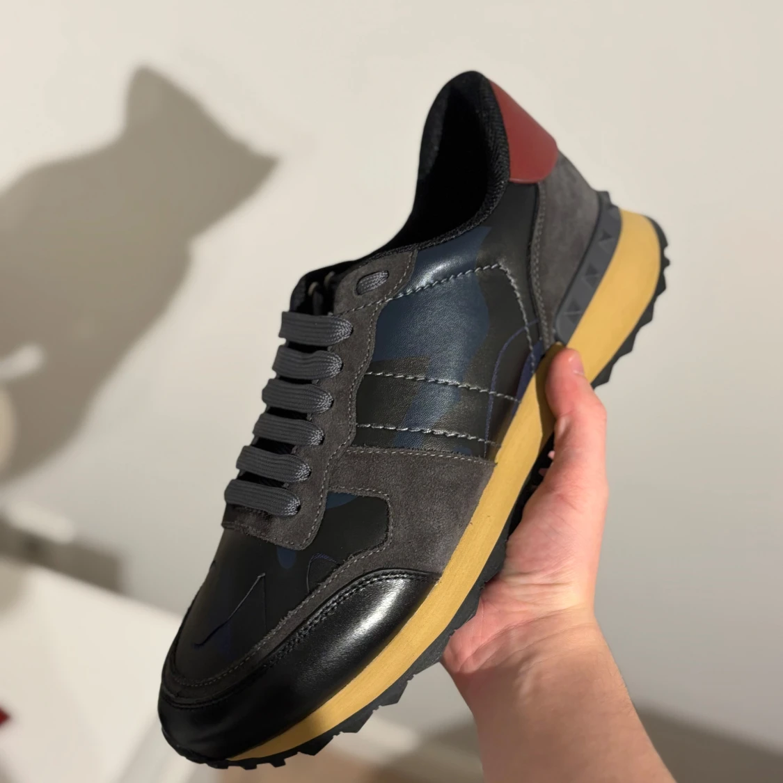 Snygga Valentino Rockrunner sneakers i en mix av svart, grå och blå med röda detaljer. Skorna har en cool camouflagemönstrad låda och är tillverkade i en kombination av skinn och mocka. Perfekta för en stilren look med sin unika design allt og medföljs till skorna kan även gå ner i pris vid snabb affär !