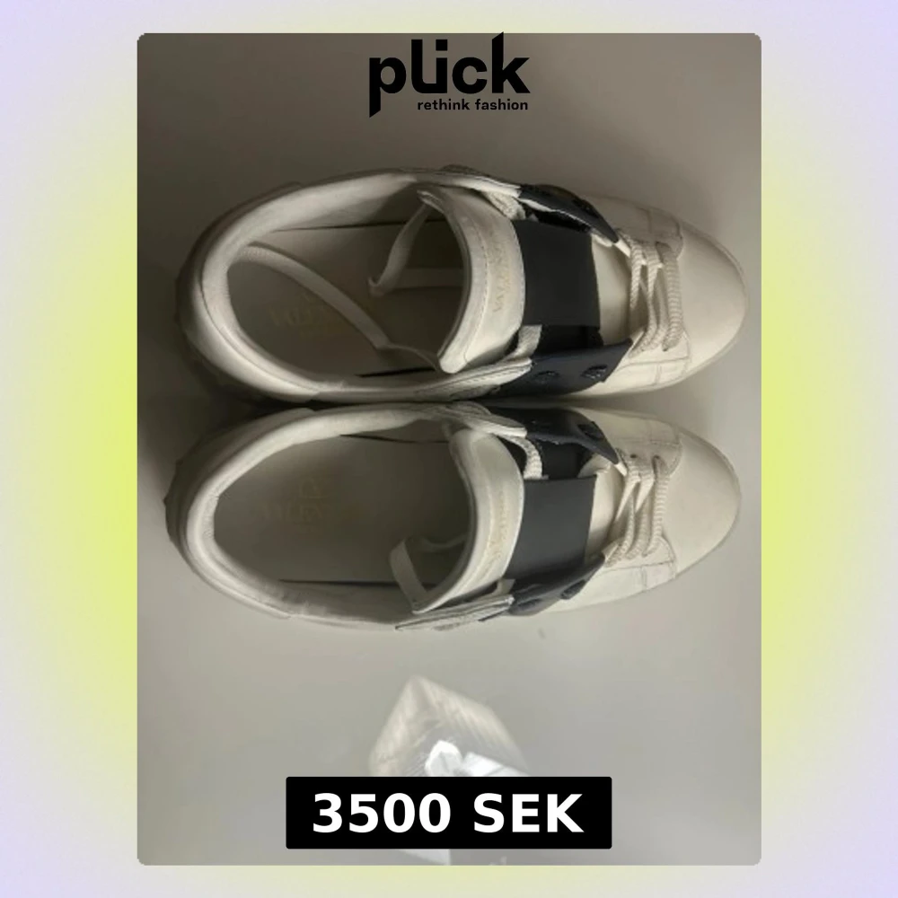 Säljer ett par Valentino Garavani Open sneakers i vitt skinn med bred svart läderdetalj över snörningen. Klassisk rund tå och platt sula. Kommer med originalpåse och box. Perfekta för dig som vill ha en clean men lyxig look.