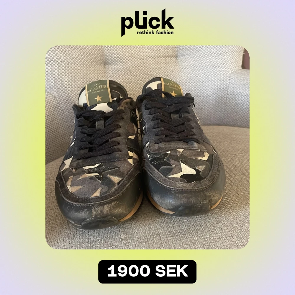 Säljer mina feta valentino rockrunners i svart och beige med coolt stjärnmönster. Inga större slitningar. Skorna har snörning och en unik detalj med nitar formade som stjärnor på hälen. Perfekta för en trendig look!