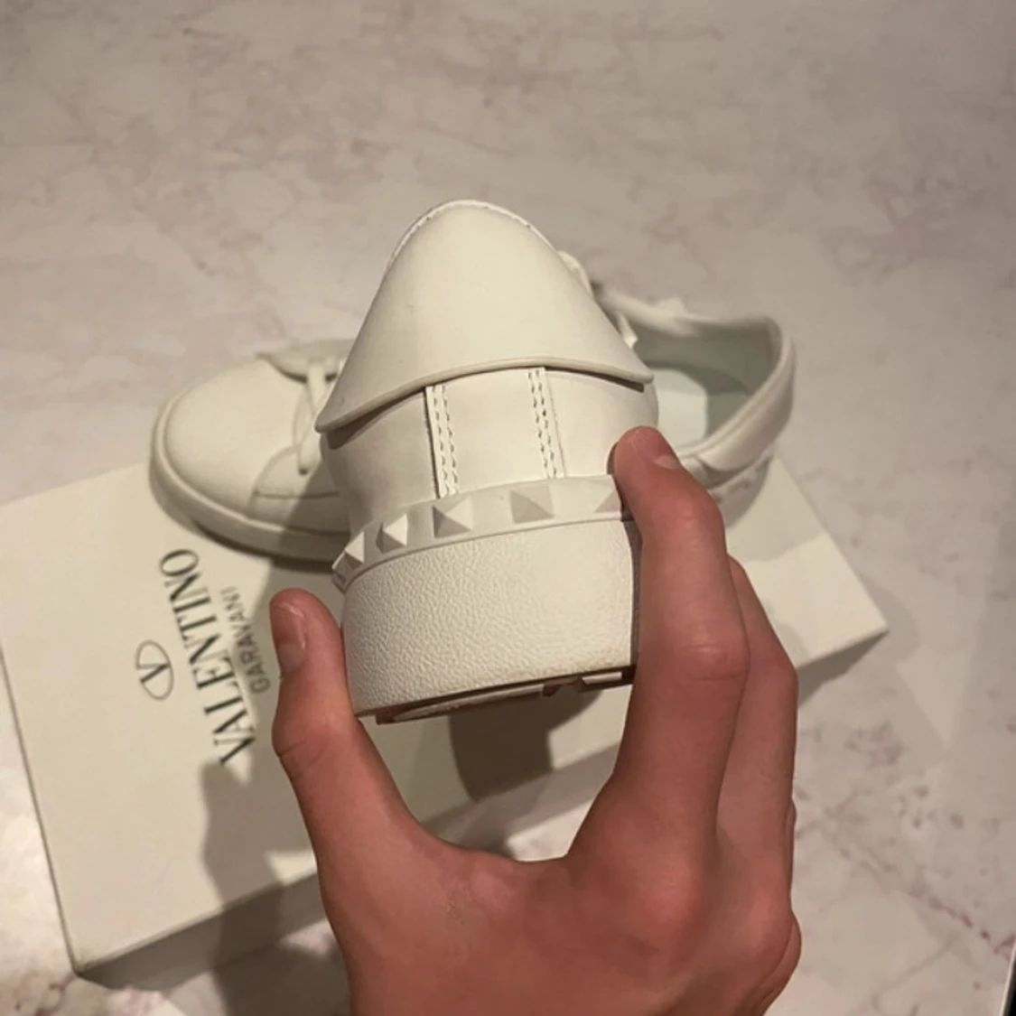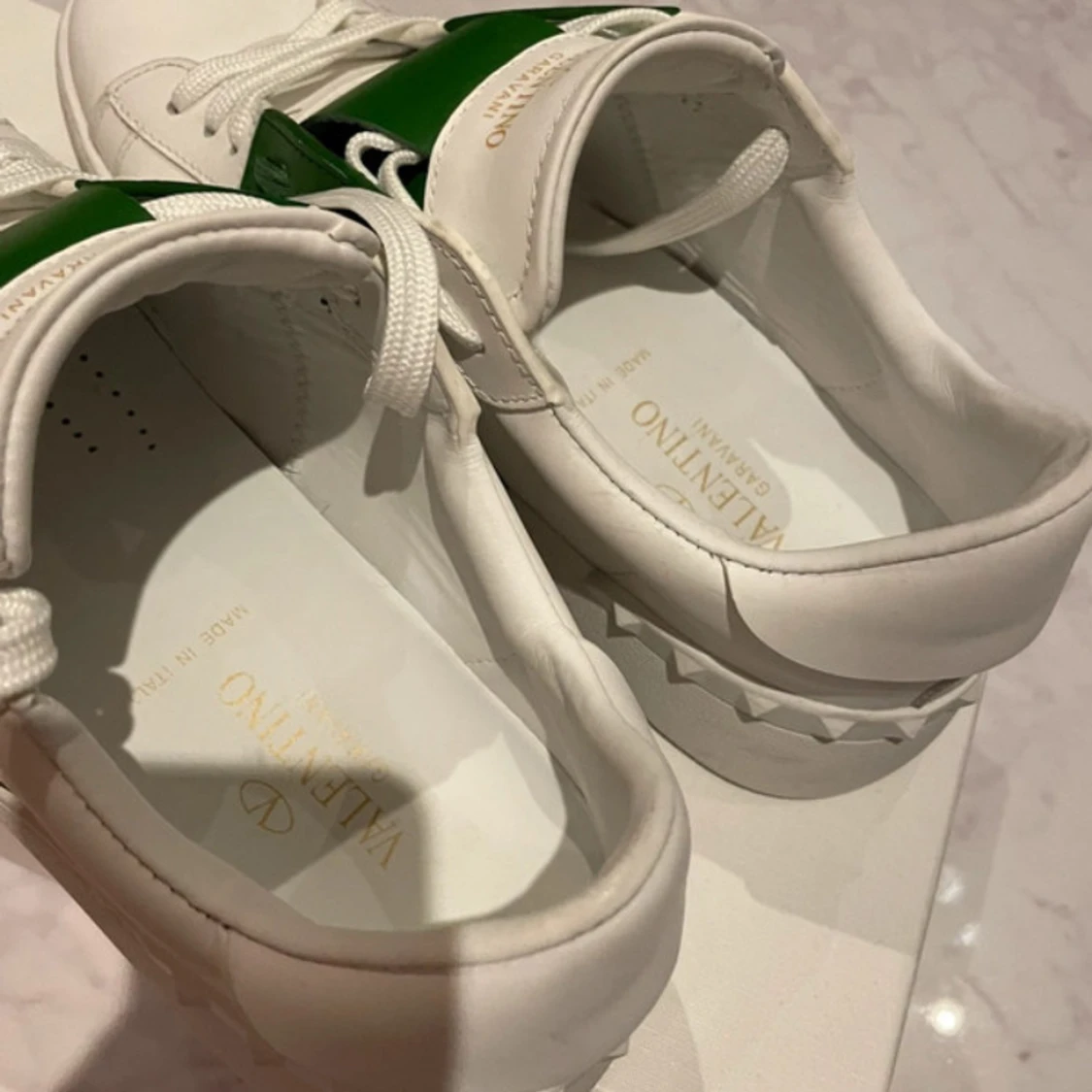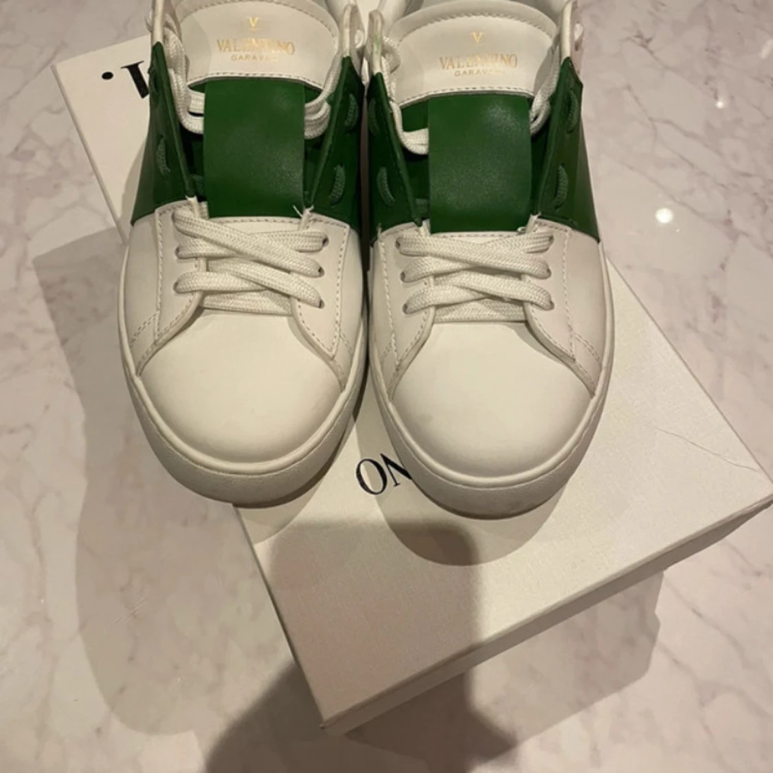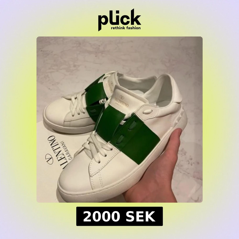 Snygga Valentino Garavani Open sneakers i vitt skinn med en bred grön läderdetalj över snörningen. Klassisk rund tå, platt sula och diskret logga i guld på plösen. Kommer med originalkartong och dustbag. Perfekta för dig som gillar exklusiva och trendiga sneakers. Pris kan sänkas vid snabbaffär